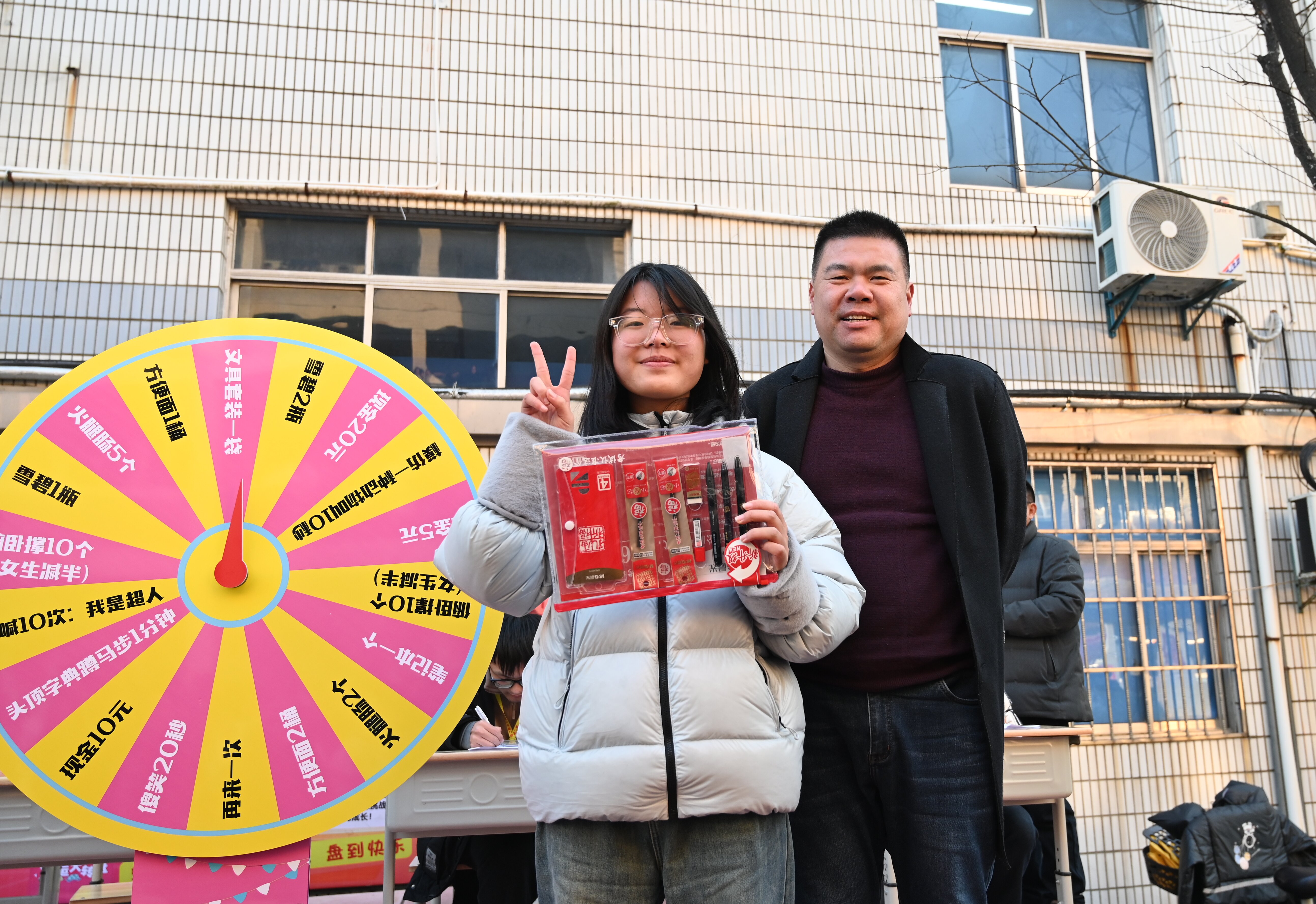 活动设计深度融合学校“六润”育人体系,将五育并举理念融入趣味体验。除学习用品外,“整理讲台”培养劳动意识,“朗诵古诗”陶冶人文情操,体能挑战则提醒学子兼顾学业与体魄。高三(16)班李佳慈抽到俯卧撑挑战后坦言:“备考离不开好身体,这场活动给紧绷的学习生活提了个醒。”高三(14)班唐嘉悦则通过活动收获了零食奖励,“晚自习和室友分享,不仅补充了能量,更拉近了彼此距离。”