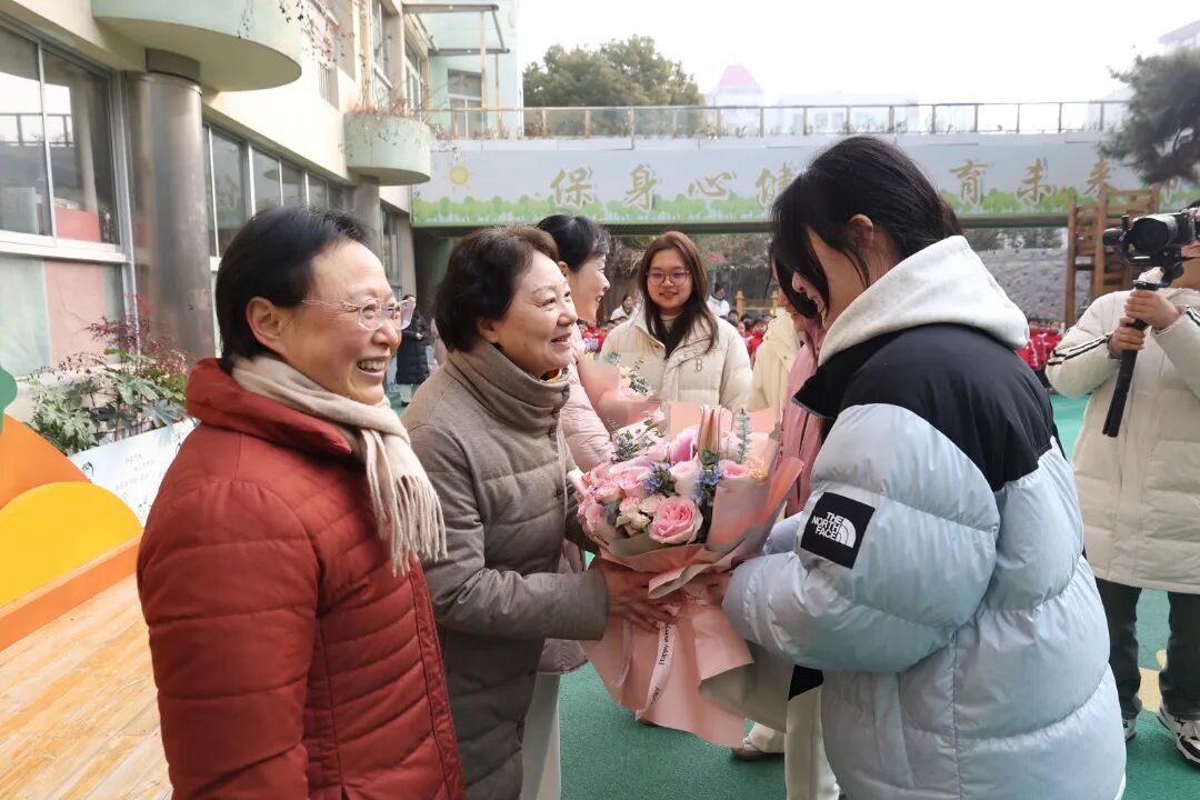 昔日老师鬓边或许添了细纹,校园角落或许换了模样,但那份藏在岁月里的感恩与眷恋,却在重逢的那一刻愈发浓烈。天刚破晓,7名大学生便相约而来,组成专属方阵,在熟悉的校园里参加升旗仪式。当晨光洒在他们年轻的脸庞,当国歌声再次在耳畔回响,那些被时光尘封的入园记忆,仿佛在这一刻被轻轻唤醒。来自东南大学的李勇楼作为学子代表发言,字里行间满是对母校培育的感恩,那些关于成长的感悟,在时光的加持下格外动人,引得全场阵阵共鸣。幼儿园的7名小朋友代表,捧着鲜嫩的鲜花,迈着稚气的小碎步,向学长学姐们献上最童真的问候;大学生们则手持芬芳,走到马燕、王珊、温玉兰三位任课老师面前,深深鞠躬,热情拥抱,敬赠鲜花。学子们围在老师身旁,指尖触碰着时光的痕迹,诉说着别后的岁月,有两位老师已退休,她们的目光温柔得能融化时光,小朋友的笑脸纯真得不染尘埃,这跨越十六年的同框暖景,让时光仿佛在此刻倒流,又在欢笑中静静定格。