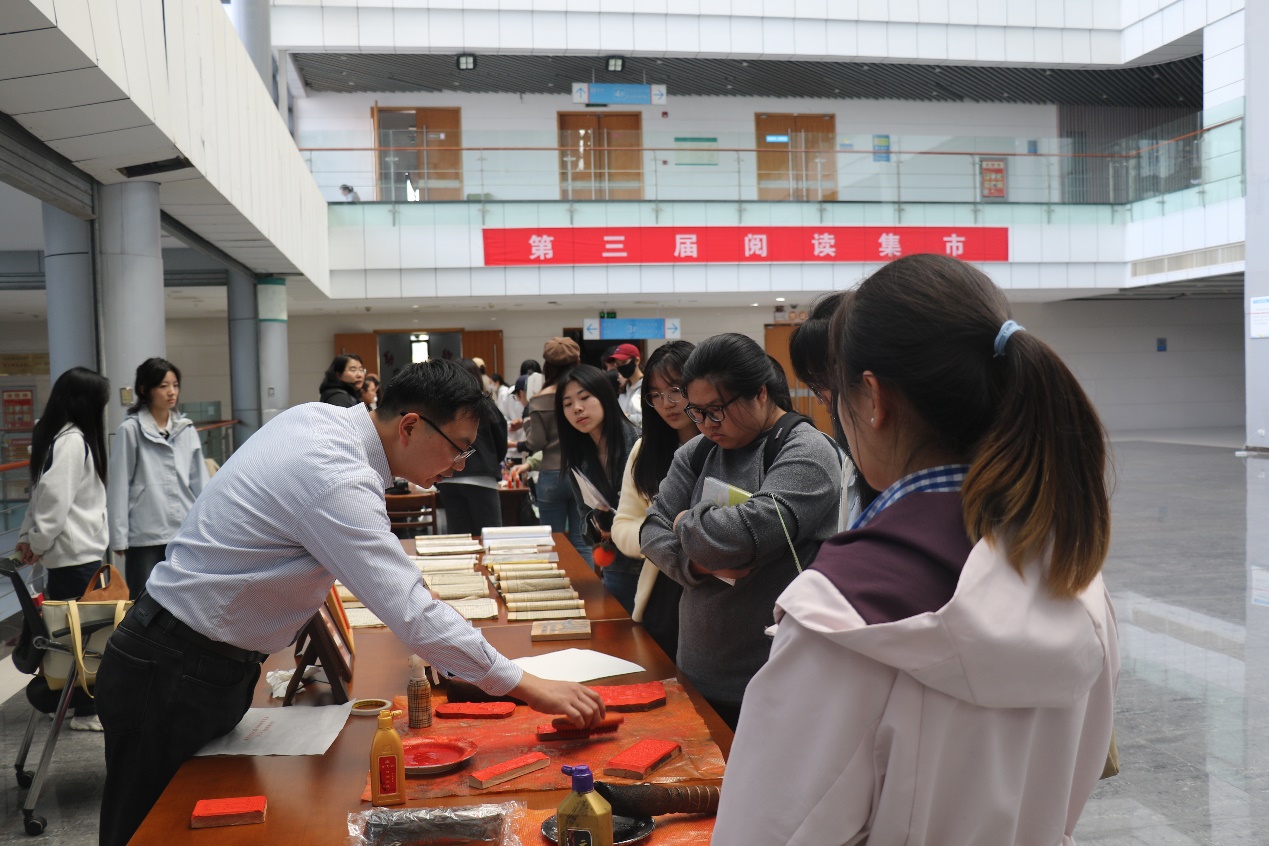 活动现场的传统文化游园会吸引了众多师生积极参与,大家踊跃参与到非遗拓印、漆扇、书签制作、猜谜等活动中。来自商学院的夏斯雪同学一进图书馆就被漆扇非遗制作深深吸引了,她用不同的颜色一连帮同学做了三把漆扇。“我觉得太神奇了,不同颜色经过调和,就能制作出这么美的漆扇,我一定要好好收藏起来。”她高兴地说,让非遗技艺走进校园,让广大同学动手制作、亲身体验,这是在青年学生中传承弘扬非遗技艺的最好方式。