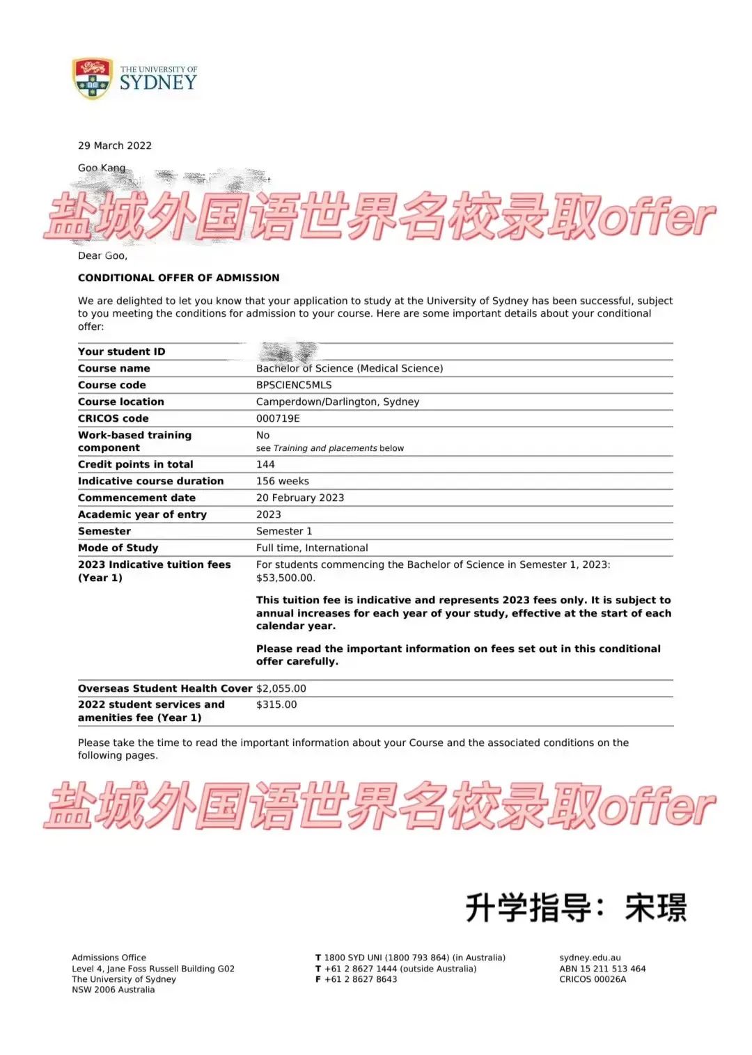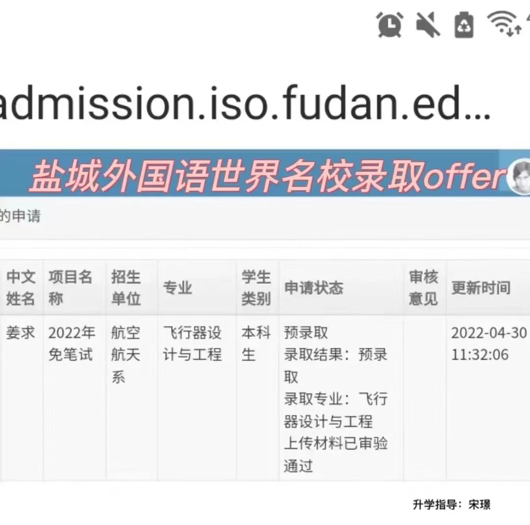 3月初以来,复旦大学经严格的材料审核,通过初试、复试、面试,盐外姜求同学一路过关斩将,最终以优异的成绩成为复旦大学的预录生。迄今,姜求同学已经先后收到了来自澳洲悉尼大学健康科学专业和生命科学专业、复旦大学航天航空系飞行器设计与工程专业的预录取通知书。与此同时,4月底,姜求同学还收到了澳洲弗林德斯大学临床医学专业本硕博连读面试邀约。