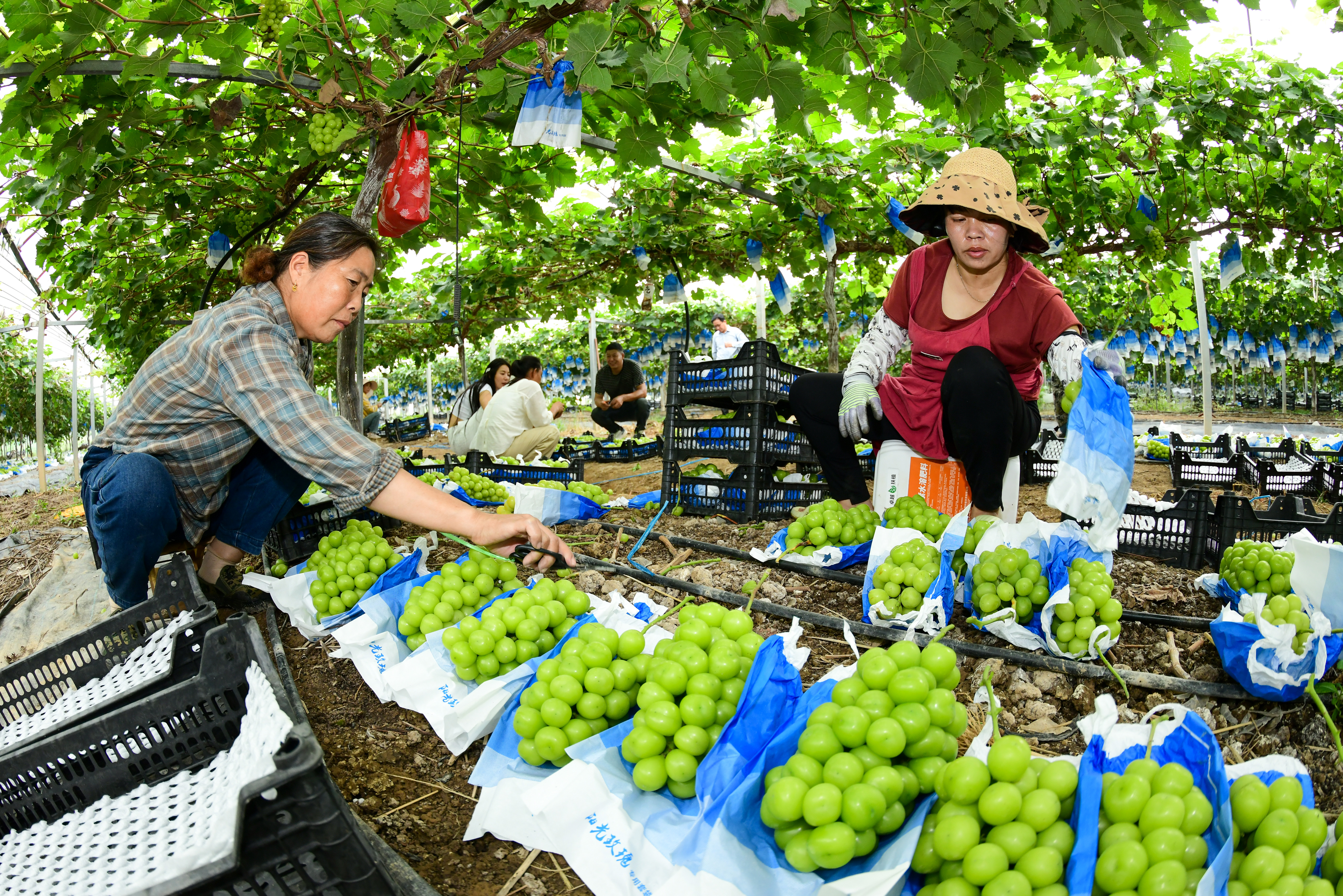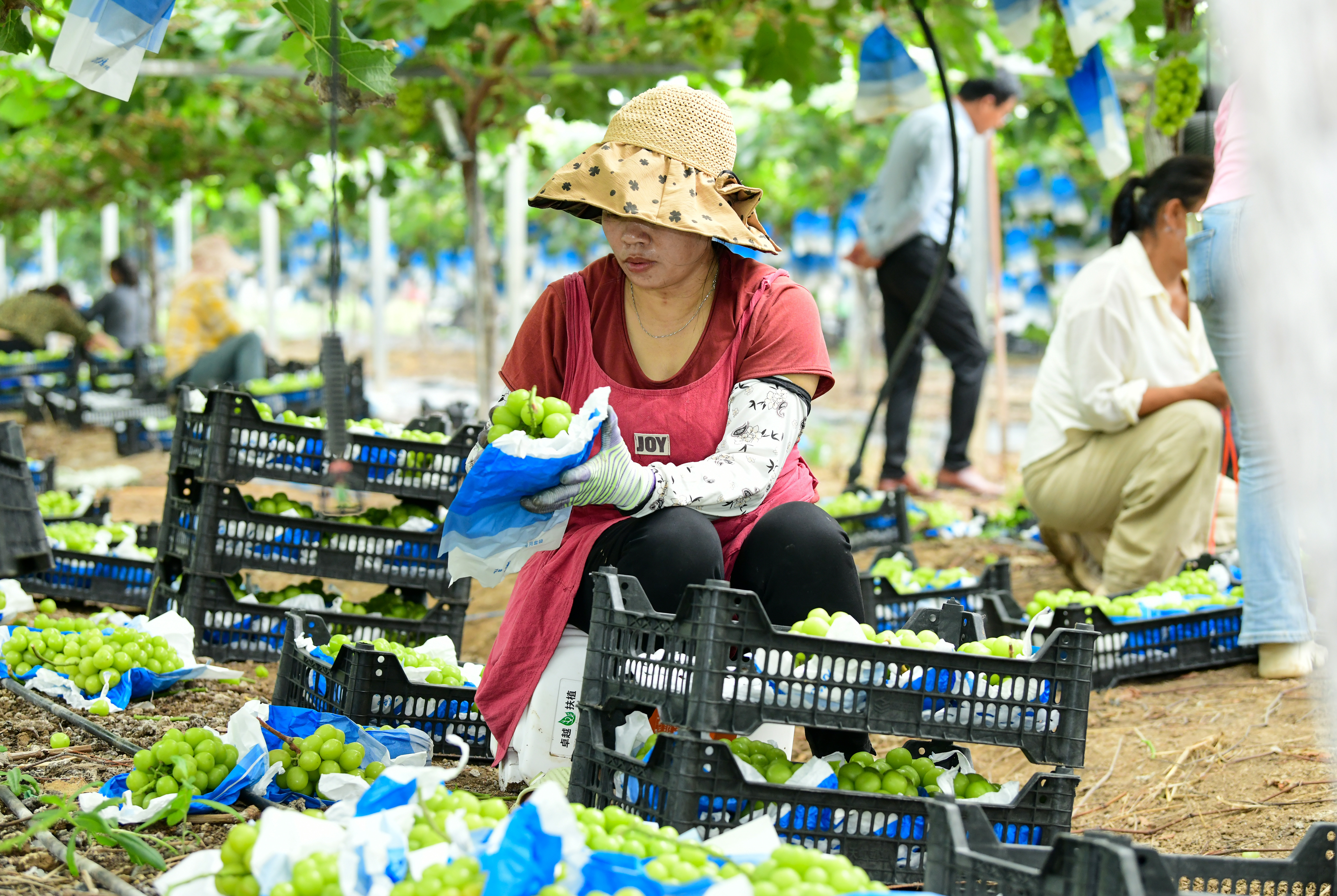9月29日,滨海县八巨镇东顺葡萄园里,工人正忙着采摘成熟的葡萄,打包、装车后发往各地市场,田间地头一派丰收繁忙景象。
