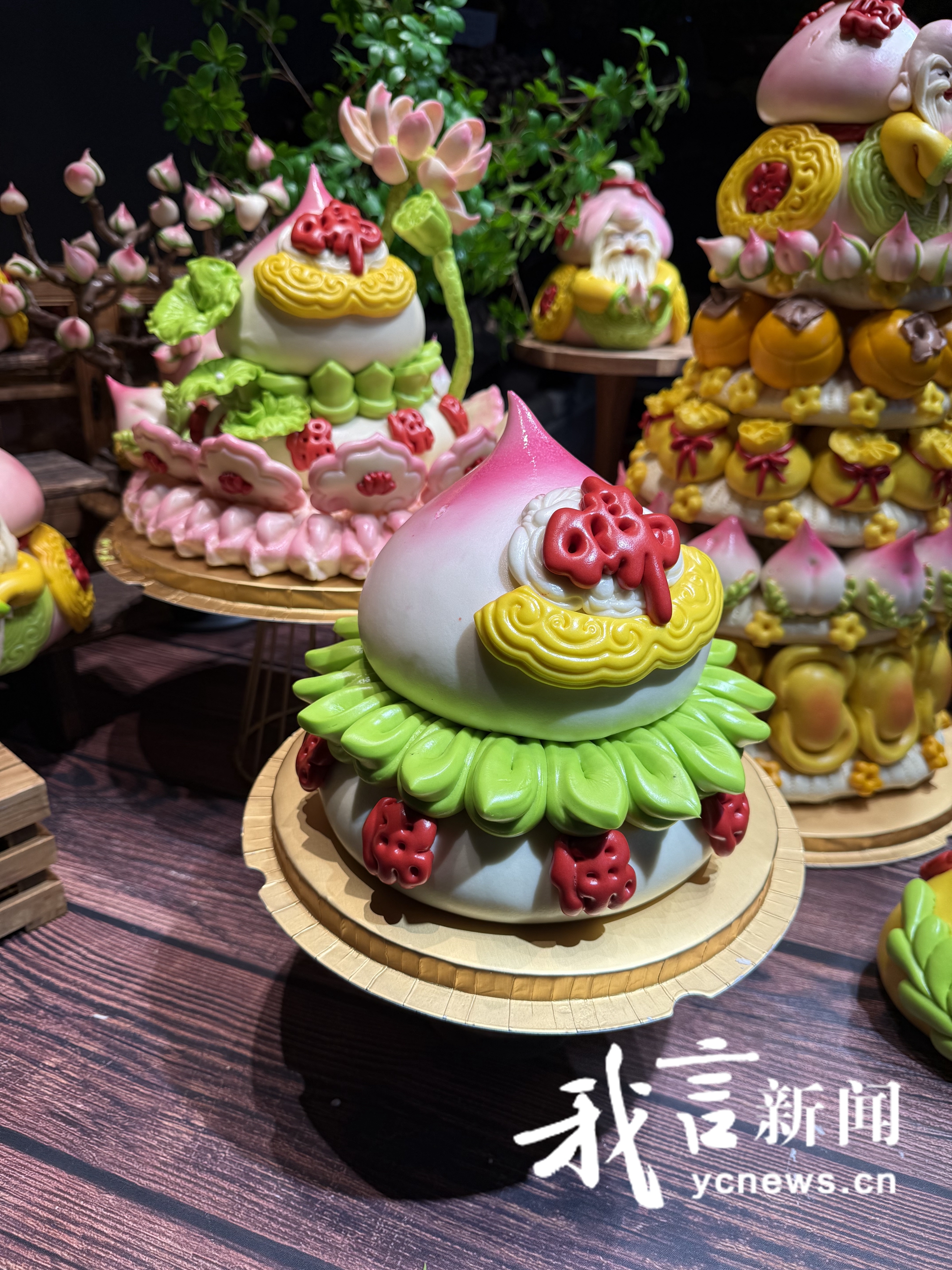 更特别的是,他擅长把美好寓意融入每一款作品:小孩满月、周岁做醒狮和福娃饽饽,中高考送“状元糕”“向日葵”和锦鲤饽饽,婚嫁庆典用龙凤呈祥套盒,老人寿宴摆起八层、九层的“寿桃塔”,就连情人节的巧果、新春的苹果福袋九宫格套盒,都成了传递心意的特色选择。