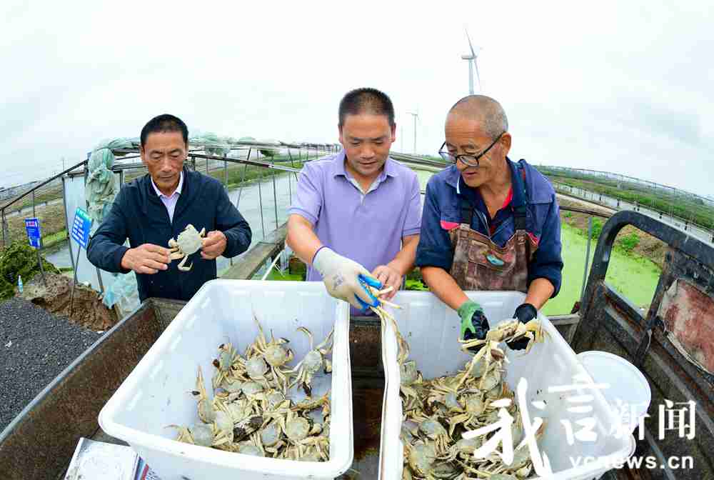 连日来,在射阳县黄沙港镇海丰社区螃蟹养殖基地,蟹农们忙着捕捞螃蟹,供应市场。