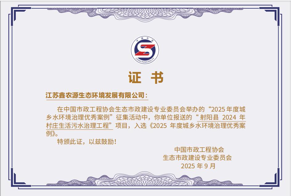 近日,中国市政工程协会生态市政建设专业委员会公布2025年度城乡水环境治理优秀案例,射阳县2024年村庄生活污水治理工程项目成功入选。据悉,该案例由射阳县农水集团下属江苏鑫农源生态环境发展有限公司申报,是盐城唯一入选案例。