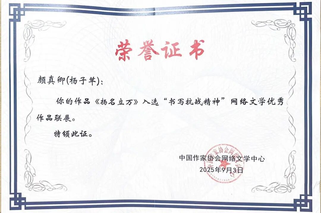 近日,我市青年网络作家、盐城幼儿师范高等专科学校小教22级本科班学生杨子芊(笔名颜真卿)收到中国作家协会网络文学中心颁发的荣誉证书,其作品《扬名立万》入选“书写抗战精神”网络文学优秀作品联展。