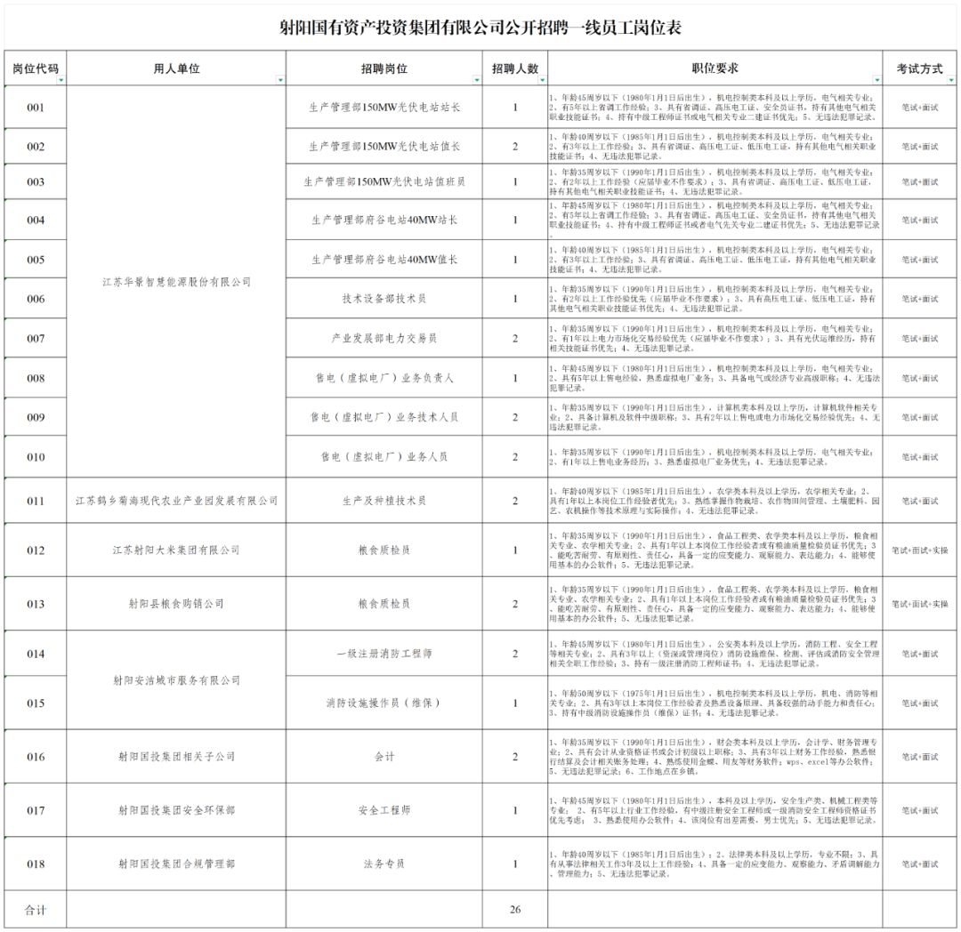 射阳国有资产投资集团有限公司旗下子公司因生产经营需要,经批准,公开招聘一线员工26名。