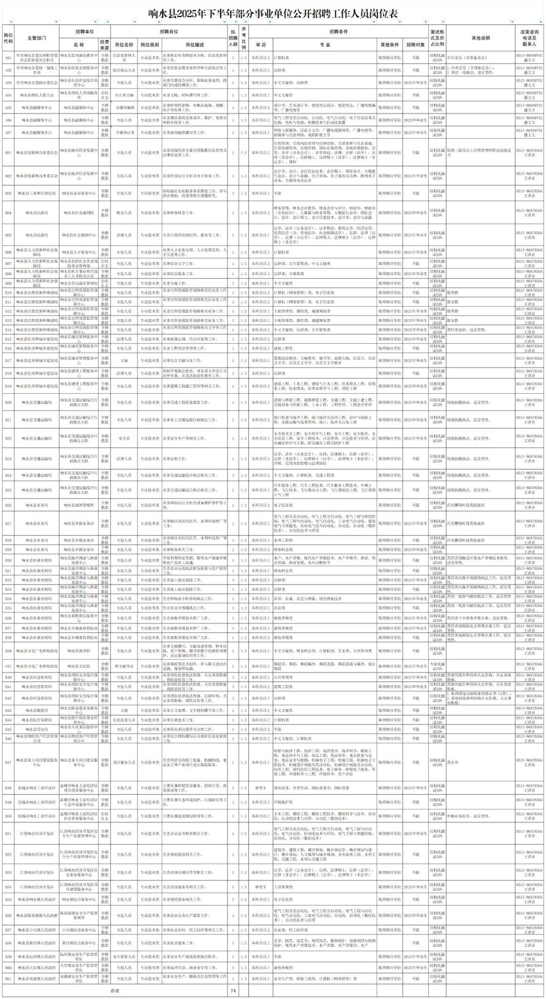 为更好地选拔优秀适岗人才,优化事业单位人员结构,根据《关于进一步做好事业单位公开招聘工作的通知》(人社部发〔2024〕57号)和《江苏省事业单位公开招聘人员办法》(苏办发〔2020〕9号)等文件精神,响水县2025年下半年事业单位公开招聘工作人员74名。