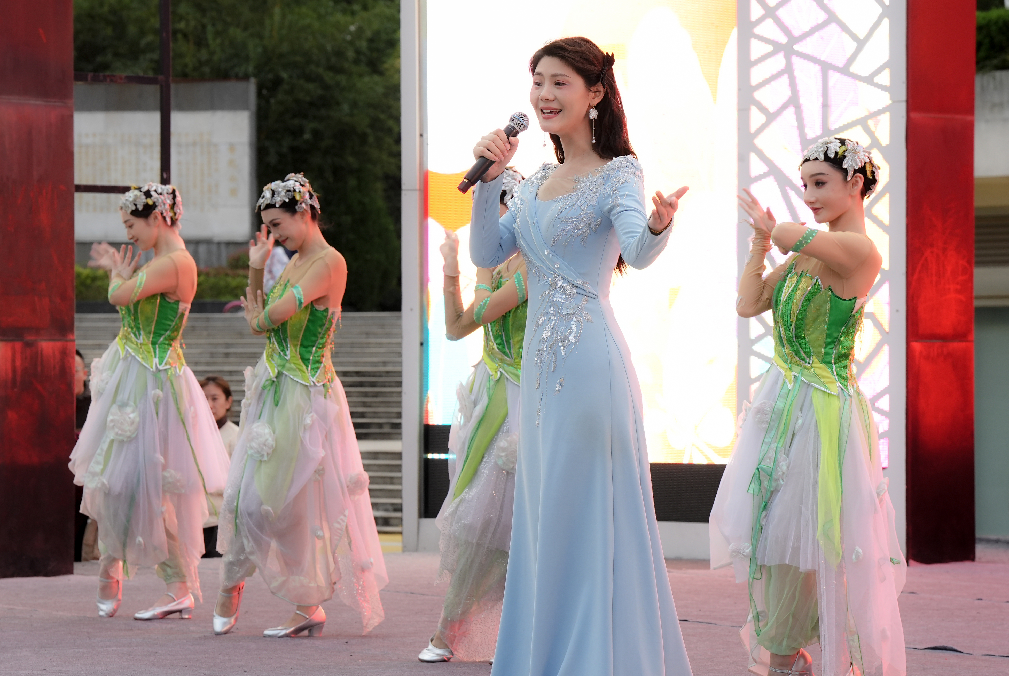 整场演出节目形式丰富多样、亮点纷呈。夏新涛带来的《敢问路在何方》《在此刻》两首男声独唱高亢嘹亮,极具感染力;刘冬的萨克斯独奏《乌梅子酱》《征服》搭配李佳娴的伴舞,传统器乐与现代舞蹈碰撞出别样火花;双人舞《花样年华》的柔情缱绻与女子群舞《年年有余》的喜庆灵动形成鲜明对比,展现了舞蹈艺术的多元魅力。陈权、夏勇等四位歌手演唱的《游击队之歌》《弹起我心爱的土琵琶》唤起了现场观众的集体记忆,经典旋律引发全场大合唱。
