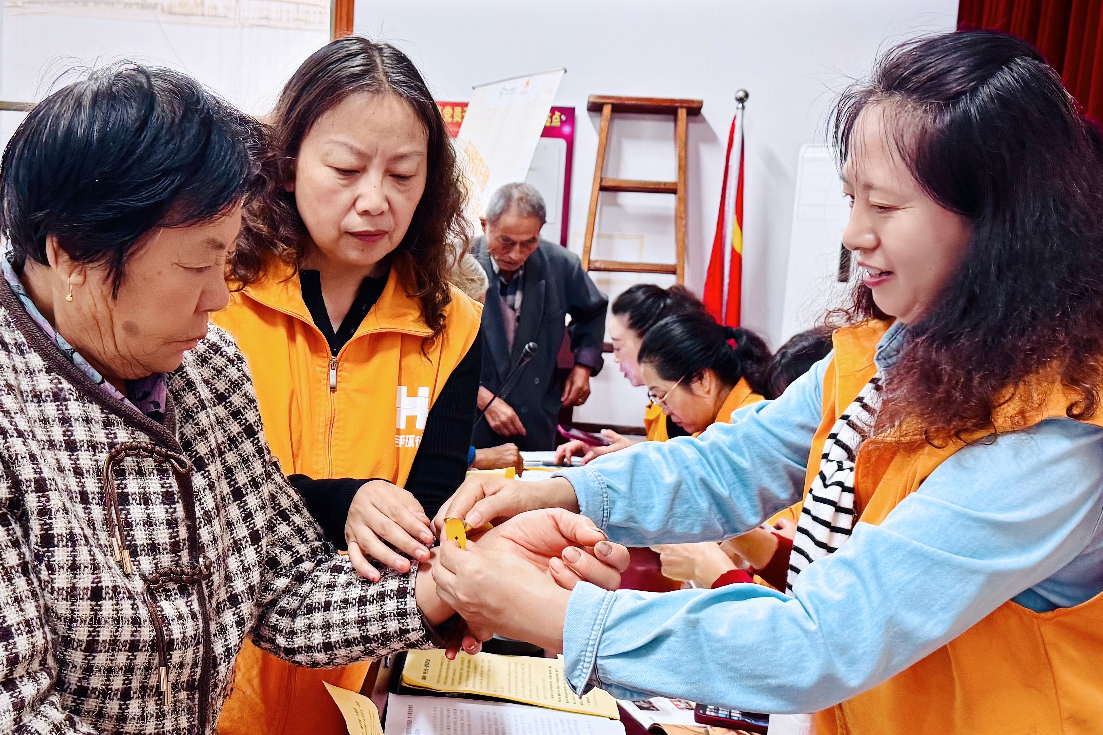 现场气氛在知识问答环节达到高潮。围绕黄手环使用技巧及党的惠民政策等问题,村民们踊跃参与,在互动中增进了认知。随后,在义工侯建梅的带领下,村民们随着《手指舞》的节奏舒展身心,现场笑声阵阵,与秋雨交织成温馨画面。活动尾声,“黄手环行动”项目负责人徐志刚通过问卷调查深入了解村民需求,义工们则分发资料、耐心答疑。符合条件的老人在登记后现场领取了黄手环,不少老人紧握义工双手表达谢意。