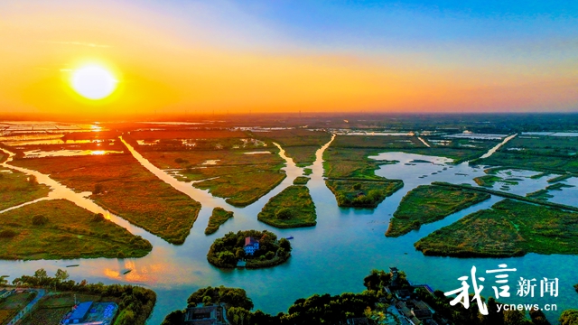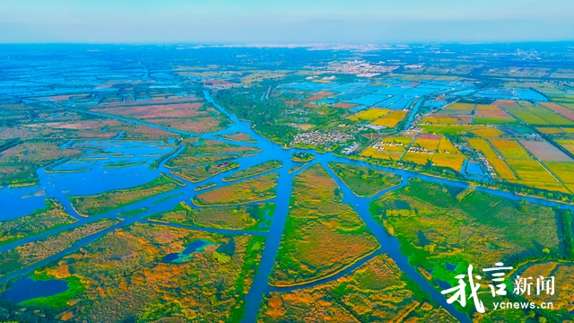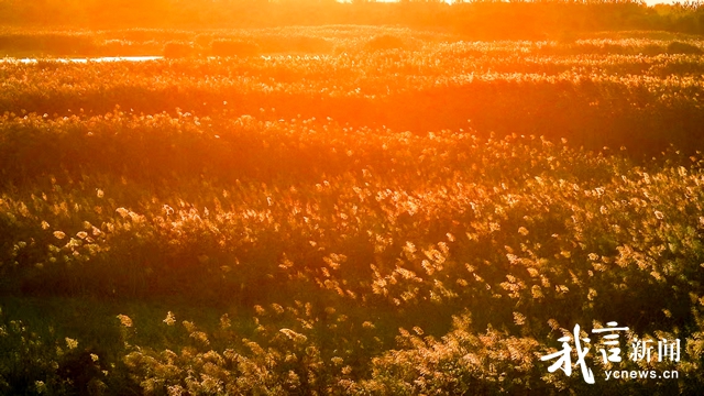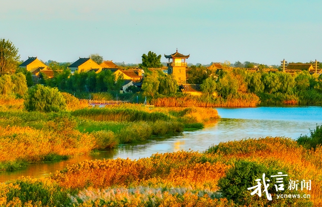 芦苇荡在秋风中泛起金色波浪,树木换上黄绿交织的秋装,别有一番韵味。