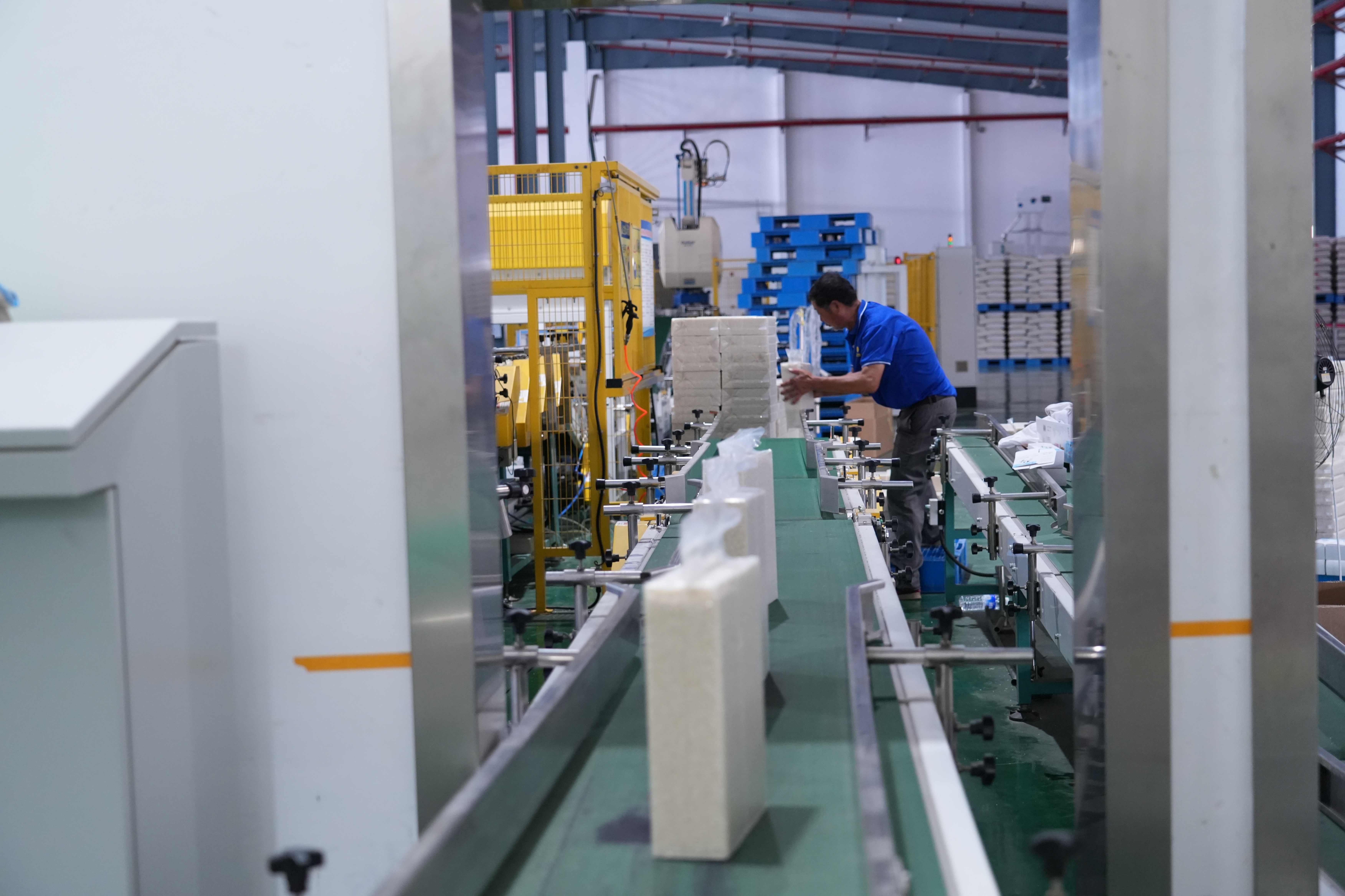 在这里,从自动包装到码垛,成品米经过装袋、封箱、仓储,全程只需两到三人辅助操作,成品米完成整个入库流程仅需不到一分钟。