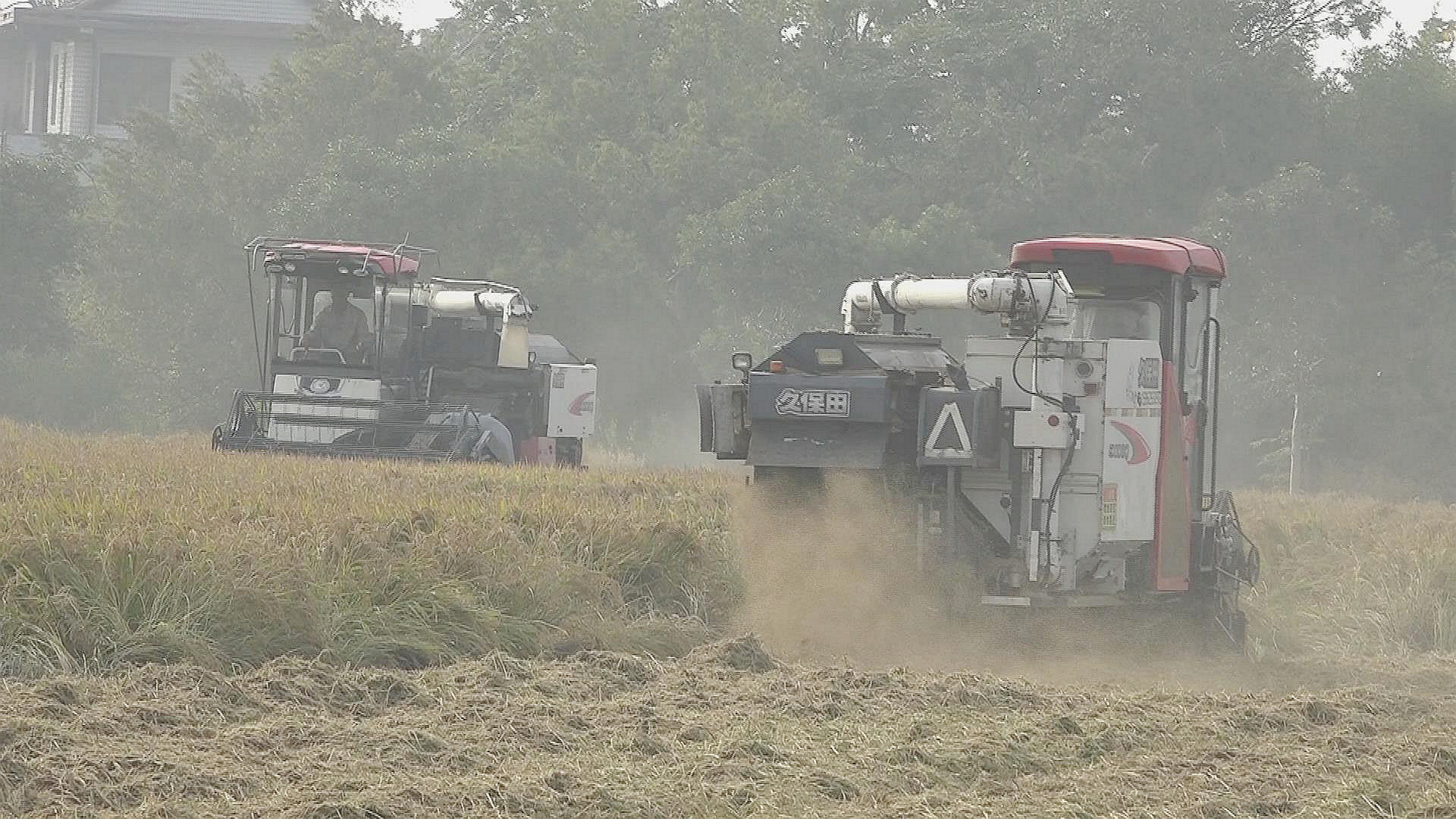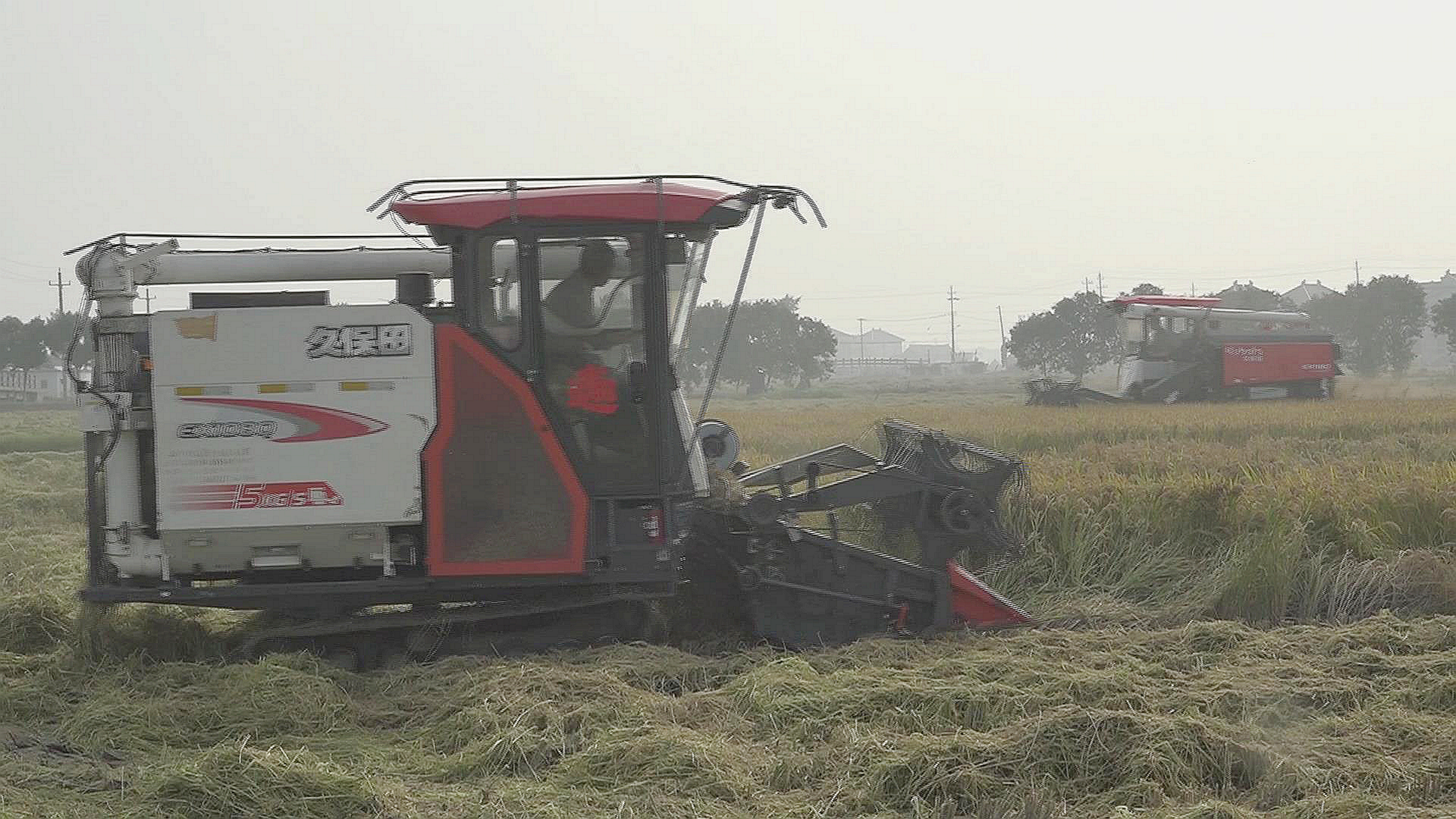 当日上午10时许,漫天的大雾刚刚散去,五烈现代农业示范园的水稻种植田地里,阵阵稻香扑鼻而来,一望无际的稻田里黄绿相间,整齐茂密的稻秆被沉甸甸、黄灿灿的谷穗压弯了腰,几台联合收割机在稻田里来回穿梭,将一茬茬饱满的稻穗“吞”入“肚中”,割穗、脱粒、粉碎秸秆,一气呵成。