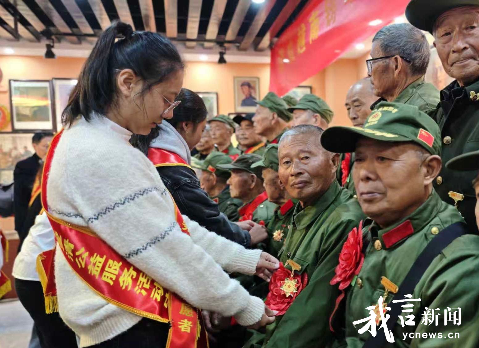 11月9日,盐城市爱清红色文化教育陈列馆内暖意融融,60余名年过八旬的老兵齐聚于此,重温烽火岁月,共话家国情怀。尽管岁月已染白鬓发,但老兵们精神矍铄,风采依旧,胸前佩戴的大红花格外醒目——这是仇爱清志愿者团队与盐城师范学院大学生们为他们献上的敬意。