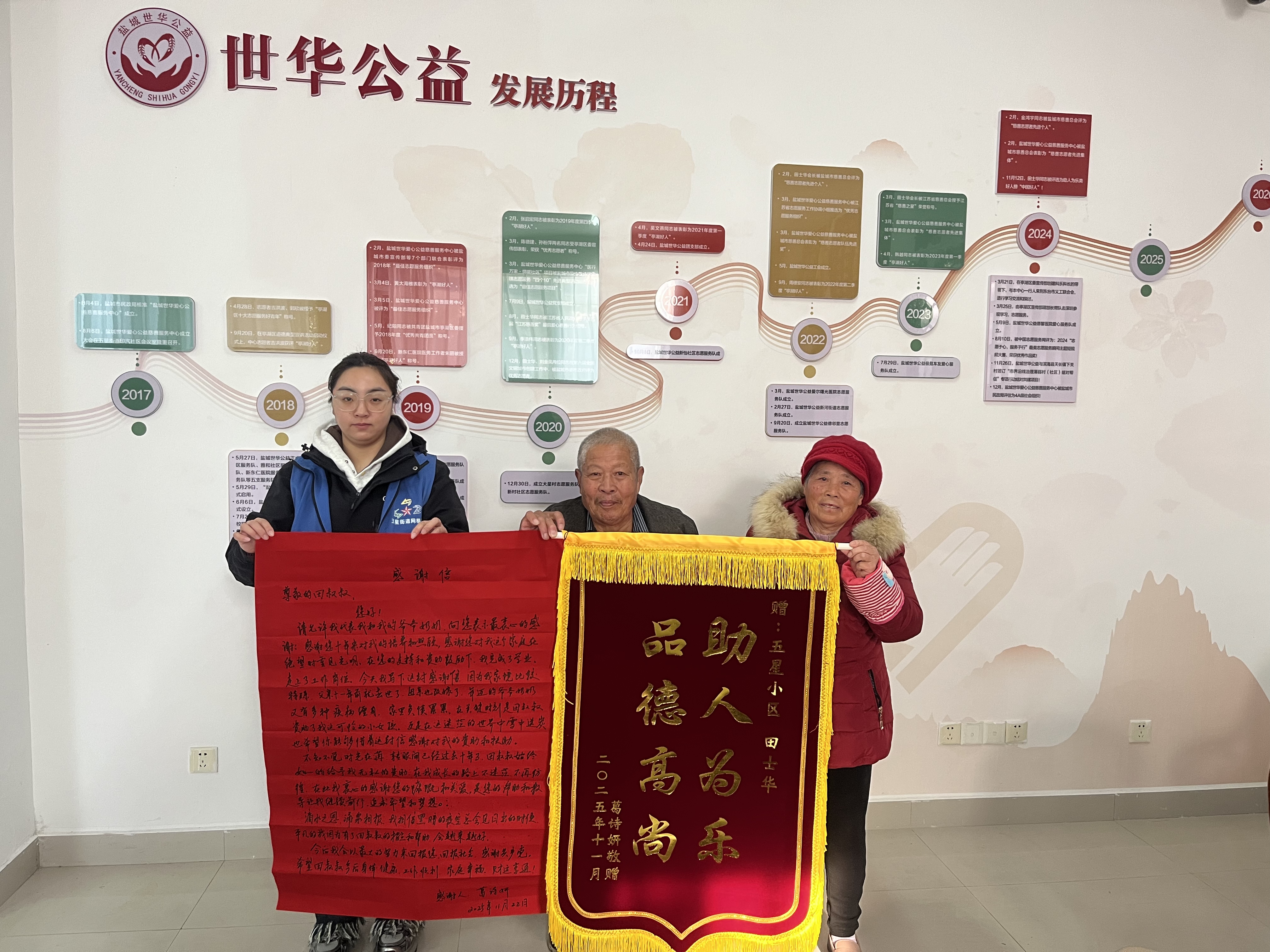 11月24日上午,走进位于亭湖区五星街道印汽社区的世华爱心公益慈善服务中心,一股暖流扑面而来。来自盐都区尚庄镇庆福村的葛德海老夫妇,小心翼翼地将一面鲜红的锦旗和一封手写的感谢信,交到社区党委书记徐小霞手中,嘱托她务必转交给世华公益慈善服务中心的负责人田士华。这面锦旗背后,是一段跨越十年、感人至深的爱心长跑。