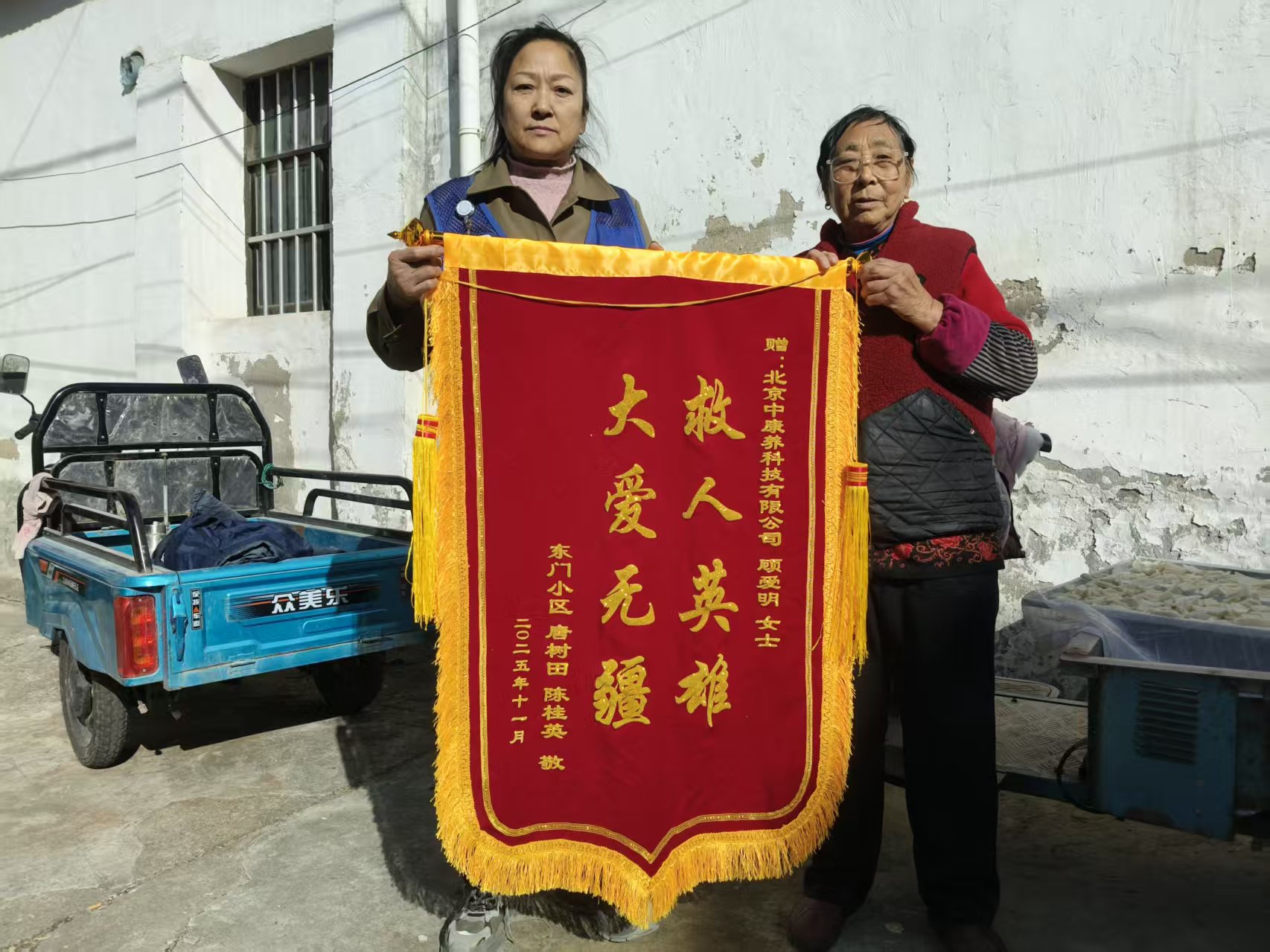 11月25日上午,家住东台市东台镇鼓楼东路83岁的陈桂英和老伴唐树田,将一面写有“救人英雄大爱无疆”的锦旗郑重递到北京中康养科技盐城公司助老员顾爱明的手中。