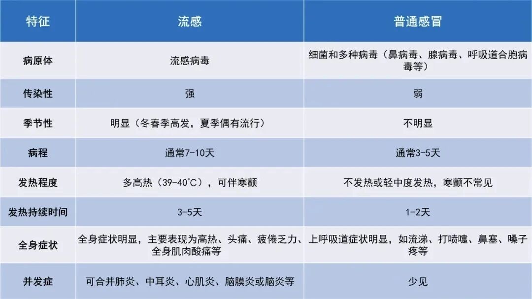流感又称流行性感冒,与普通感冒不同。流感和普通感冒的主要区别在于病原体、症状严重程度和并发症风险等。流感由流感病毒(甲型、乙型、丙型三种型别)引起,起病急骤,常伴随高热(38.5℃以上)、全身肌肉酸痛、乏力等症状,可能引发肺炎等严重并发症,传染性较强,主要在冬春季流行;普通感冒多由鼻病毒、腺病毒、冠状病毒等引起,病原种类多但致病力较弱,症状以鼻塞、流涕、咽痛为主,发热较少且多为低热,通常一周内自愈,全年均可发生,通常温差变化较大时更容易发生。