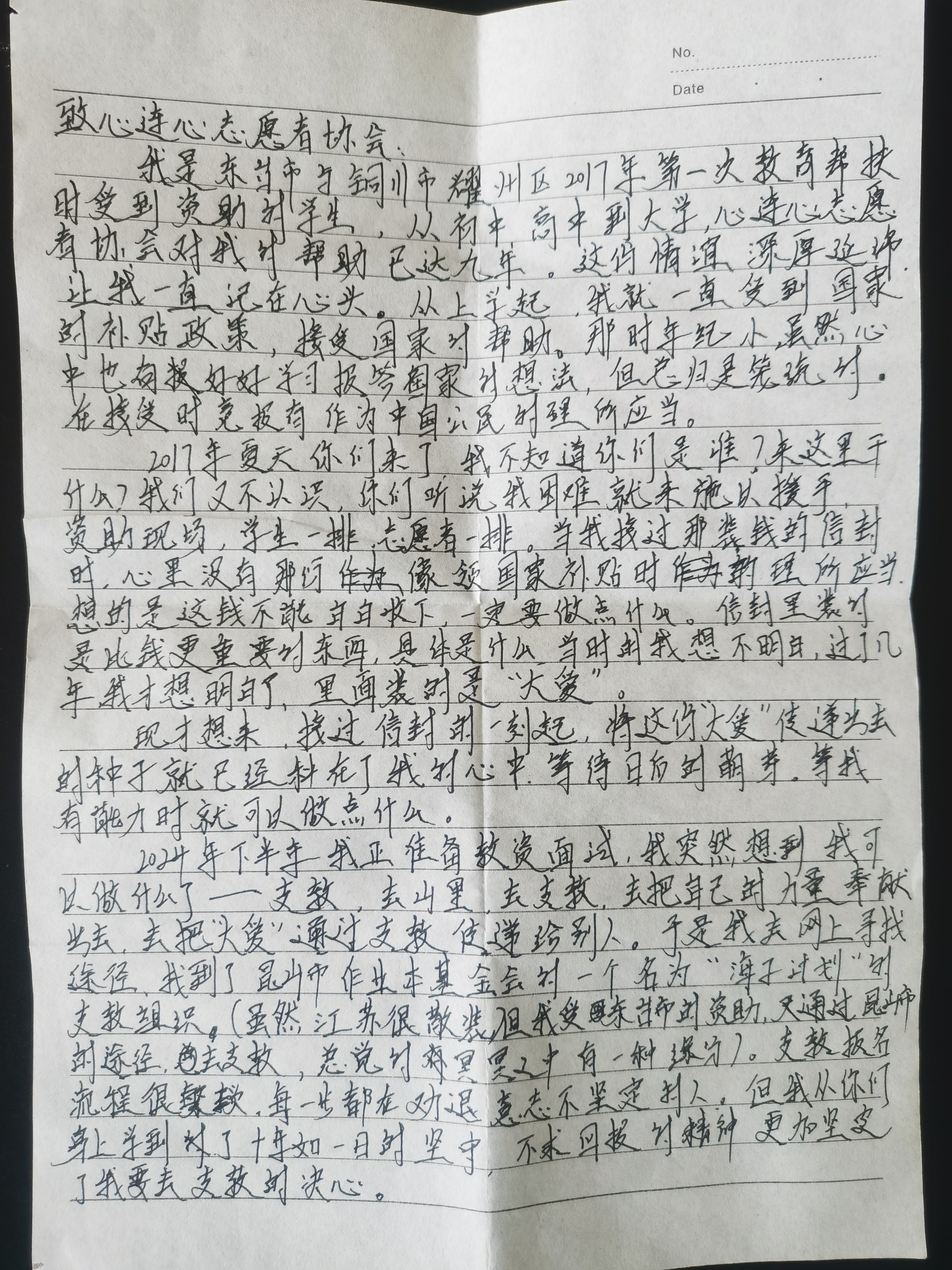 一封来自宁夏的挂号信,历经千里跋涉,于12月12日傍晚,抵达东台市心连心志愿者协会的办公室。信封里两张青春洋溢的照片、两页字迹工整的信纸,让协会工作人员想起了那个九年前在陕西省铜川市耀州区耀州中学礼堂里眼含泪光的少年——张波。如今,这位曾受“情暖耀州”公益项目资助的学子,已成为宁夏理工学院大四学生,他用一场远赴云南的支教之旅,兑现了当年的感恩承诺。