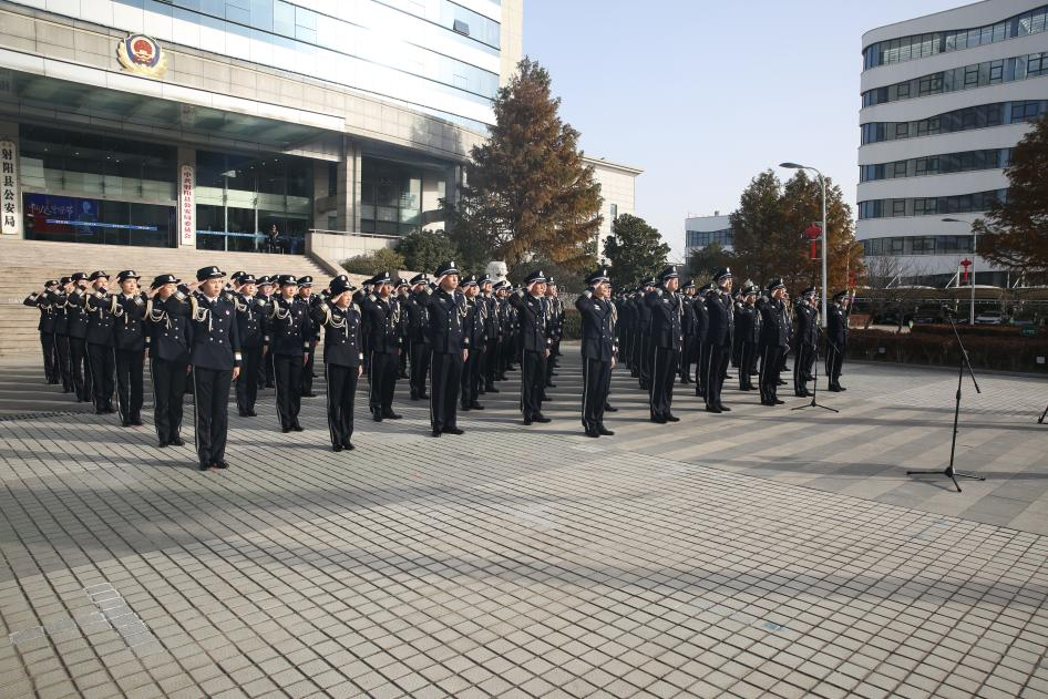 1月10日上午9时00分,射阳县公安局机关大楼前广场气氛庄重热烈。伴随着雄壮激昂的《中国人民警察警歌》,红蓝相间的警旗冉冉升起,迎风飘扬。该局局党委班子成员、各警种部门民警代表整齐列队,面向警旗庄严敬礼,并重温《公安机关人民警察誓词》。