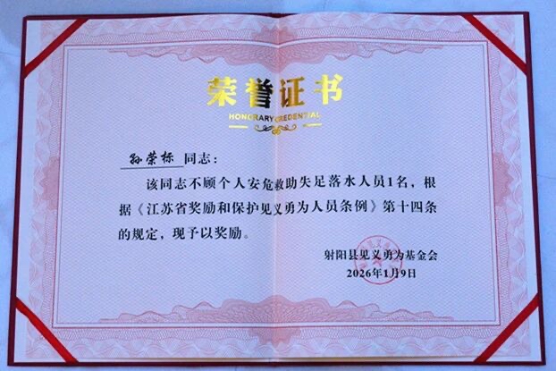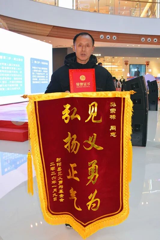1月10日是第六个中国人民警察节,同时也是全国第40个“110宣传日”,射阳县于1月9日在吾悦广场举办了主题宣传活动,60岁的退役军人孙荣标接过该县见义勇为基金会颁发的荣誉证书、锦旗和奖金时,眼眶泛红,声音哽咽:“这本是普通人该做的事……这份肯定,让我觉得值了!”