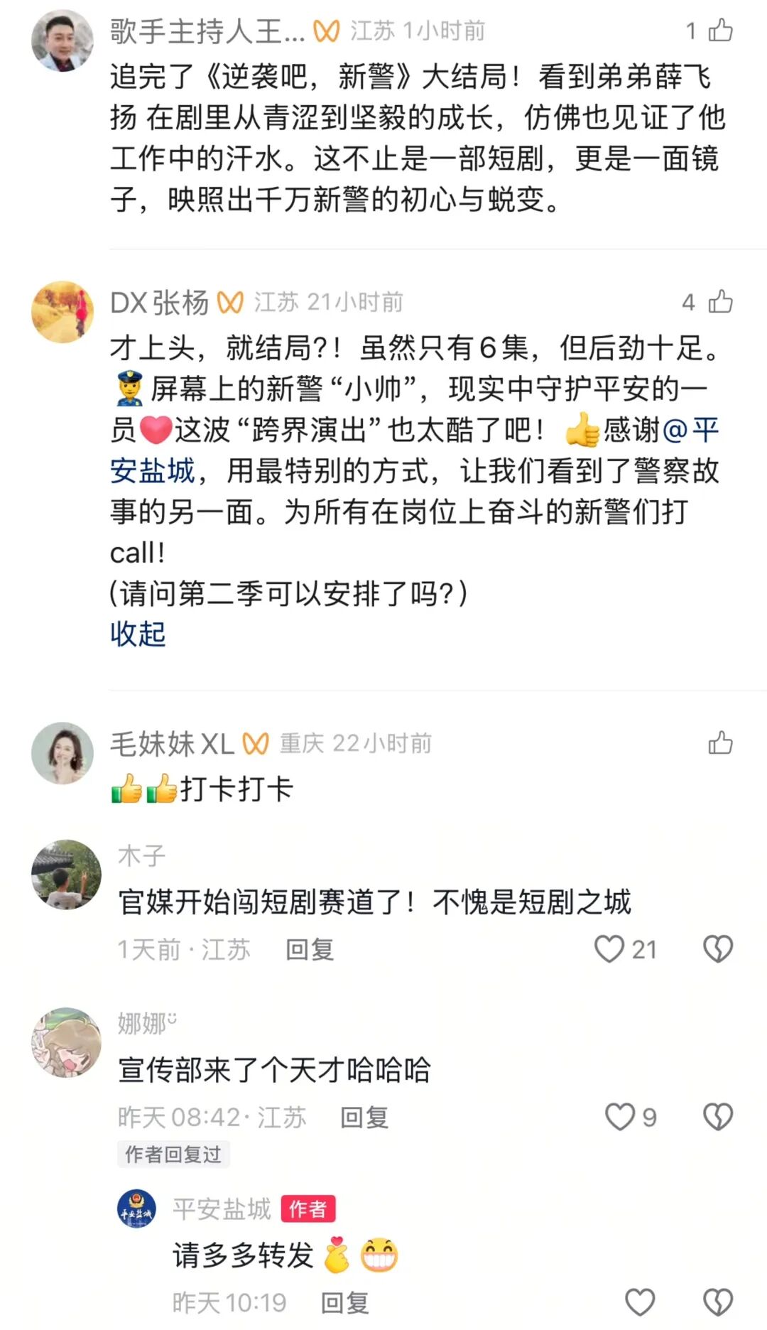 1月15日,盐城公安原创微短剧《逆袭吧!新警》最后一集已上线完结,这部没有专业剧组加持、没有流量演员坐镇的微短剧刷屏网络,网友们看完纷纷留言点赞,直言“催更!不够看,什么时候拍第二季”“后劲十足,越看越上头”“剧情好真实,警察同志辛苦了”。