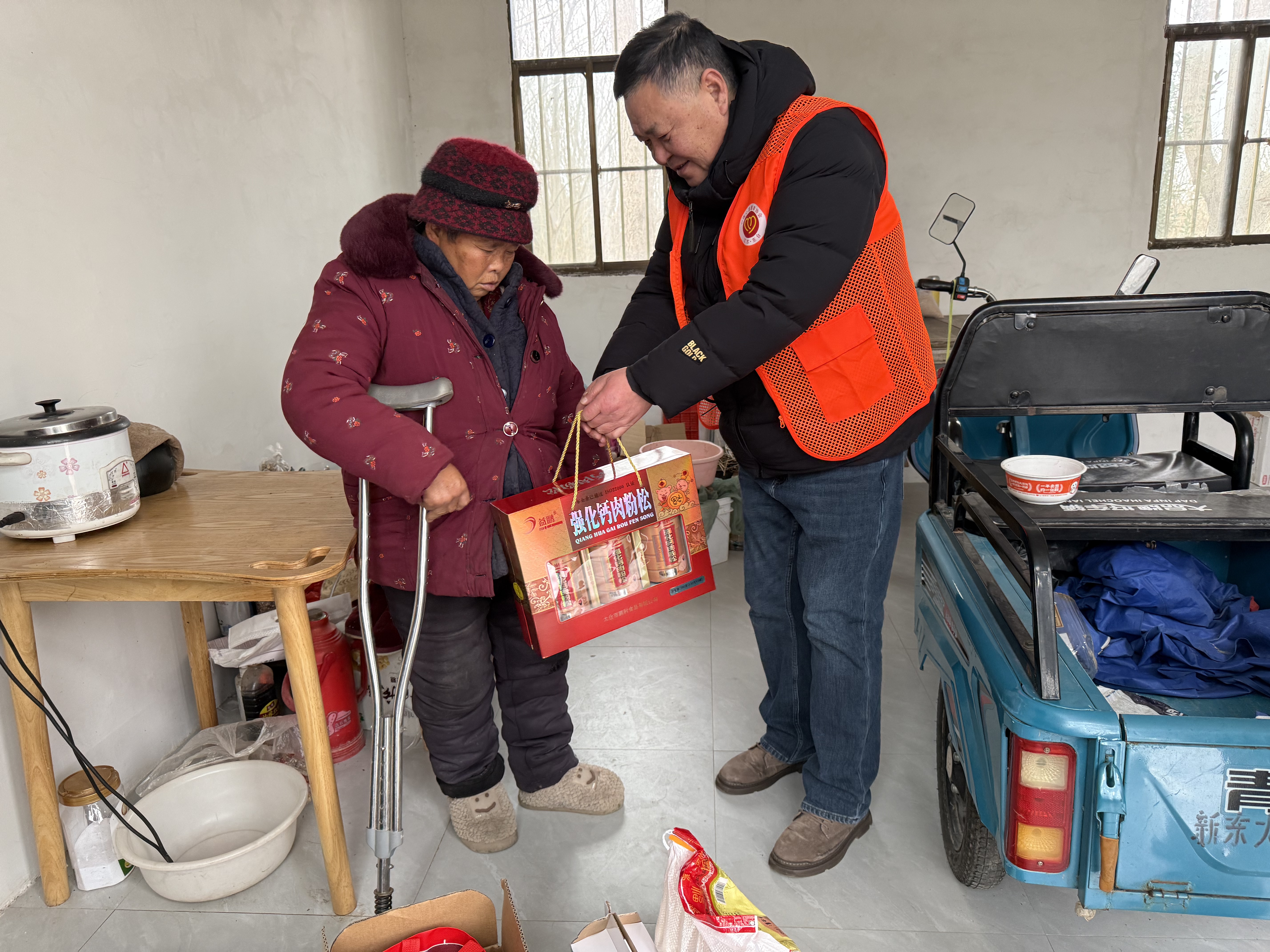 在弶港镇渔舍村,残疾人谌桃英早已拄着拐杖在家等候多时。当志愿者将慰问物资递到谌桃英手中时,她眼眶泛红:“每年都盼着你们来,这些东西够我好好过年了。”从贵州嫁到东台后,谌桃英没有生育孩子,前几年丈夫去世后,她独自生活。中风后遗症让她行动不便,低保是主要生活来源,而这份跨越寒冬的关怀,为她的新春增添了暖意。