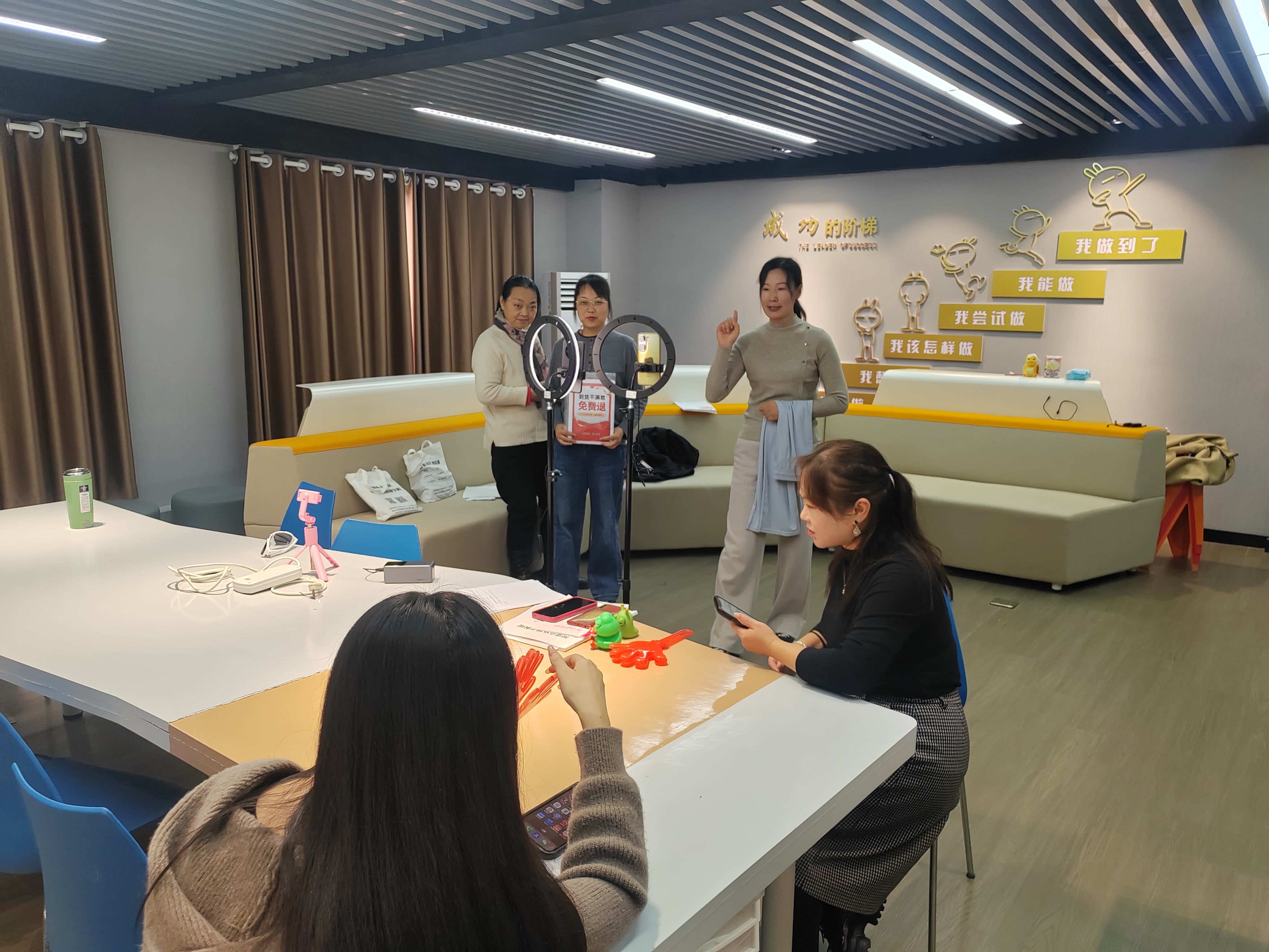 一位五十多岁的大姐,在第三次练习后终于流畅地说出“欢迎来到我的直播间”。说完她没有看镜头,而是先转向旁边的老师,像确认作业的孩子般腼腆一笑。