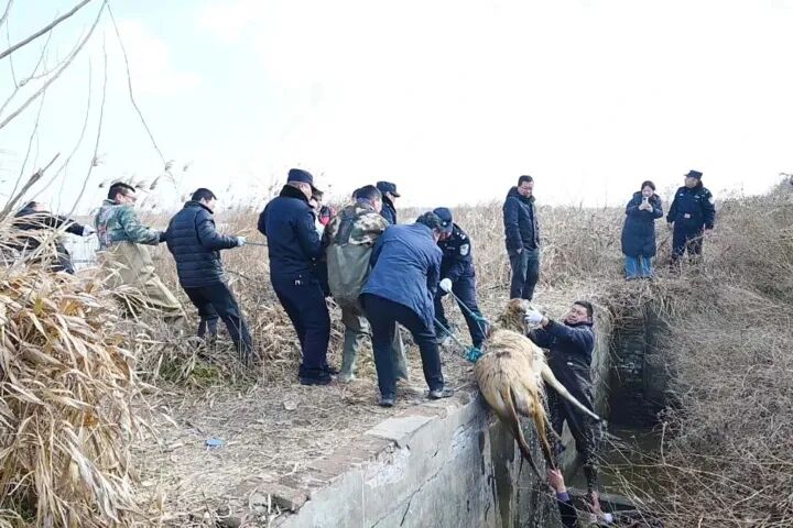 在民警与保护区工作人员的紧密配合下,大家借助绳索等工具,齐心协力将昏睡的麋鹿从沟中救出,并进行初步检查。据保护区工作人员判断,这头麋鹿很可能是在“迷路”后不慎跌入沟中。随后,工作人员为麋鹿注射苏醒药物。过了一会儿,麋鹿缓缓起身,奔向远处。在场民警和救援人员都露出了欣慰的笑容。