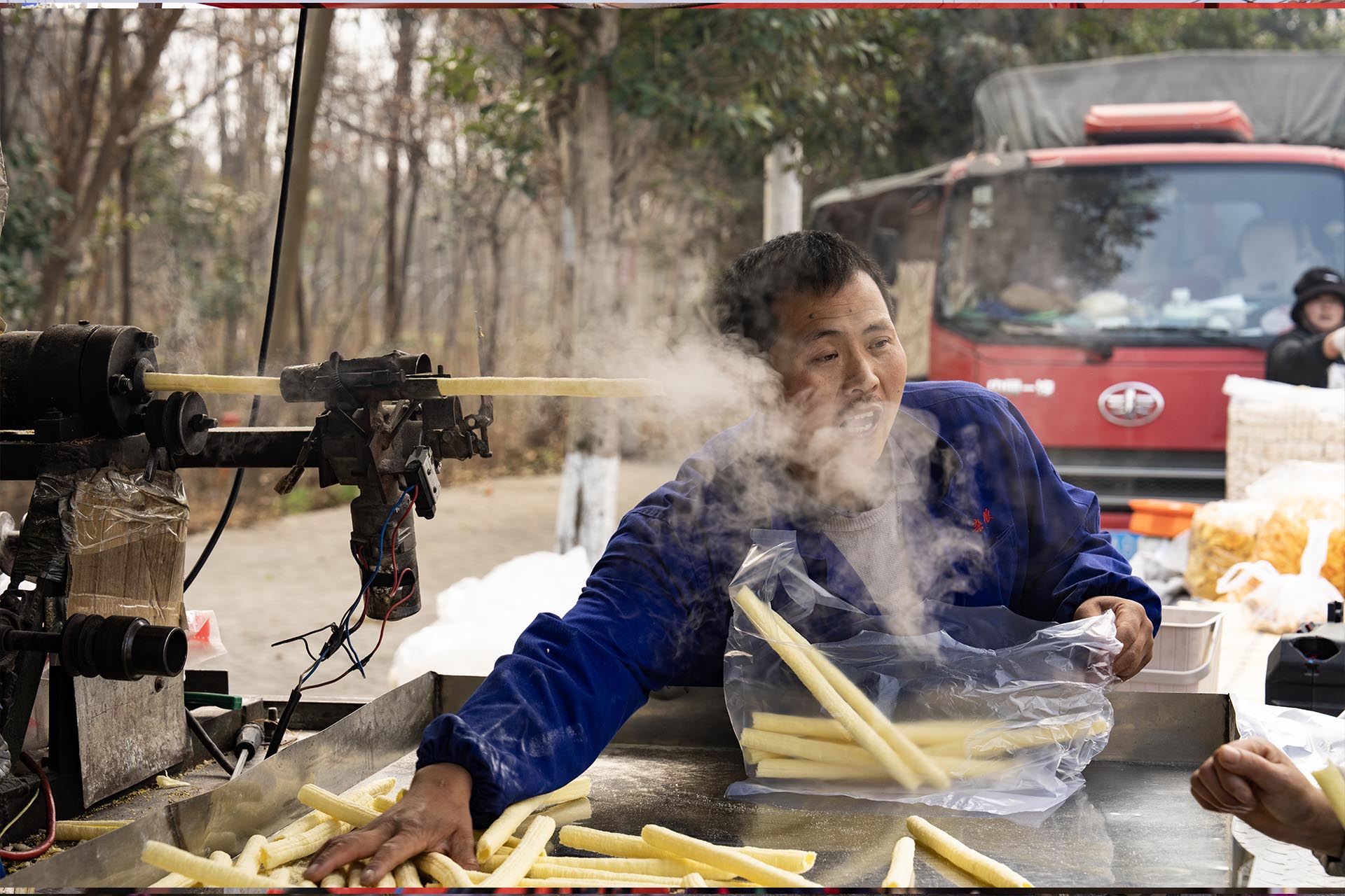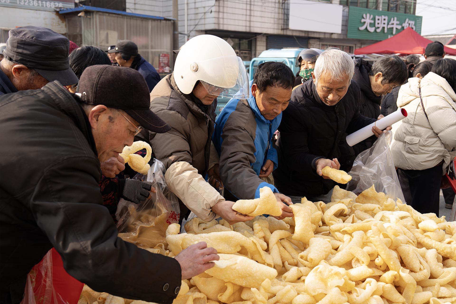 如今,天南地北的货品琳琅满目:山东苹果、河南山药、云南茨菰、章丘铁锅……本地特产同样诱人。18岁的吴艳在寒假里帮父母照看摊位,37岁的何俊峰卖的膨化果摊前围满馋嘴的孩子。当地卫生院与司法所也走进集市,开展义诊与防诈宣传,让这份传统更添安心。