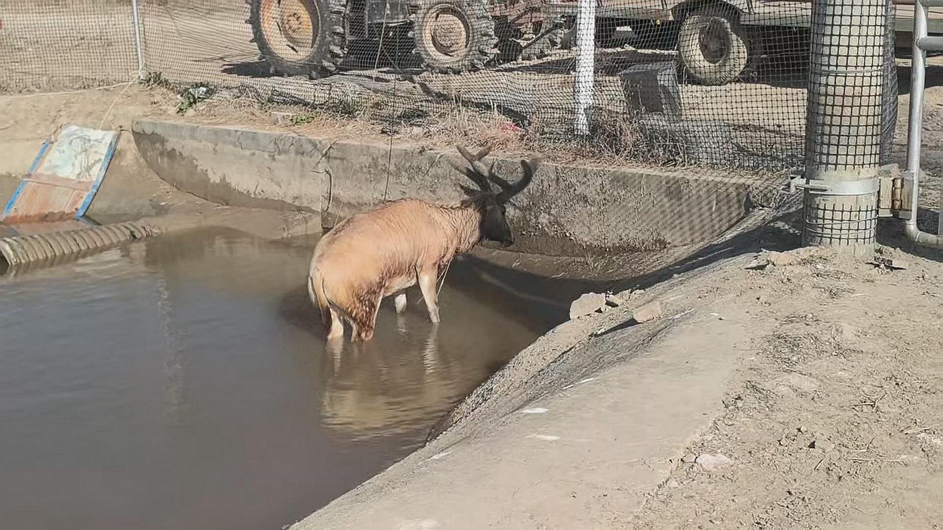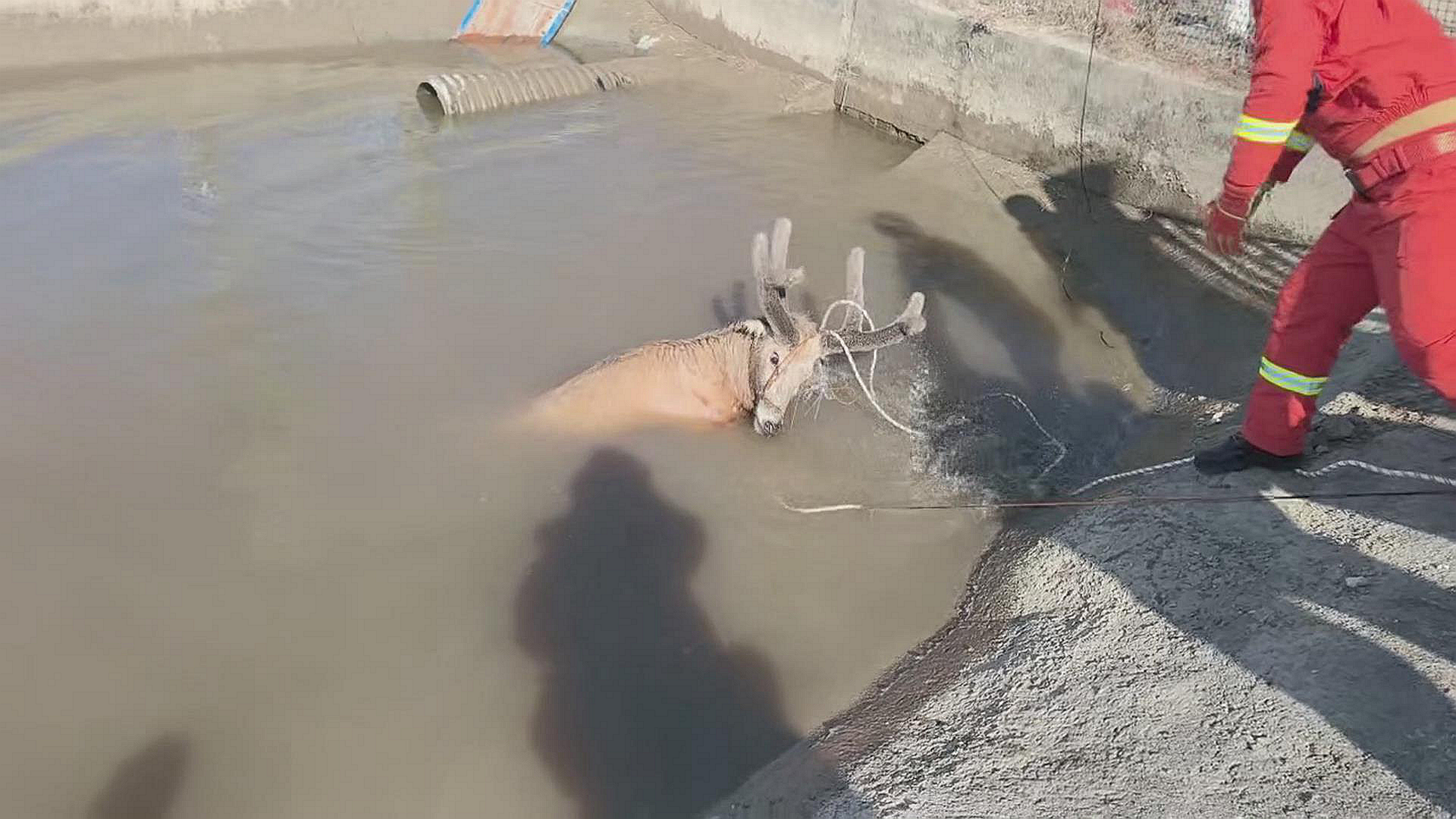据村民缪德新讲,他早上7时许起床时,发现这个水渠里有一大一小两头麋鹿被困,就把周围的村民叫了过来,找了一块跳板放到水渠里,结果那头小的麋鹿爬了上来,但大的麋鹿却怎么也爬不上来,因为担心温度太低会冻伤麋鹿,他只好打电话报警求助。