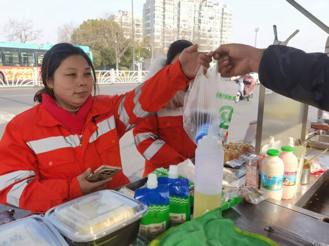 “打扫完卫生,能吃上一顿热乎乎的早餐,比什么都强。”严巧艳说,以前她每天凌晨4点就要到路上晨扫,来不及吃早餐,也舍不得花钱买,只能用保温壶带点饭菜,但冬天天气冷,饭菜放久了就变凉,吃了总觉得胃不舒服。“现在有了免费早餐,不用早起准备,还能多睡一会儿,心里特别暖。”