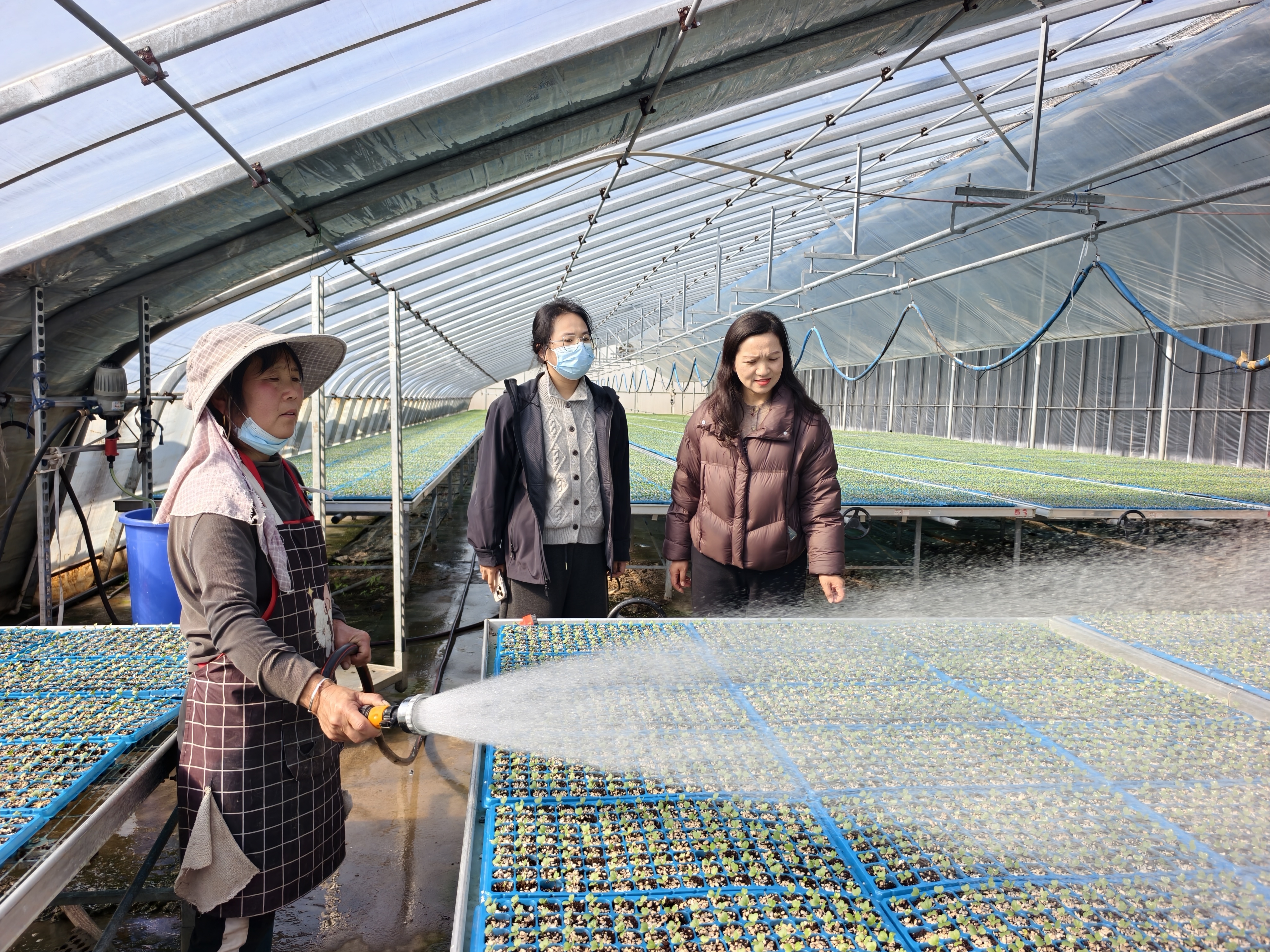 “科技种田,风调雨顺。马年更是个丰收年,祝新年日子越过越红火。”在盐城万洋食品集团有限公司育苗基地里,徐亚兰给正在为西兰花幼苗细心喷水的工人陈海梅拜年。她说:“育苗中心要提前七天练苗,促进西兰花苗适应大田生长环境;及时调盘,促进幼苗生长一致,加强肥水和温度管理,培育壮苗,避免出现高脚苗。”
