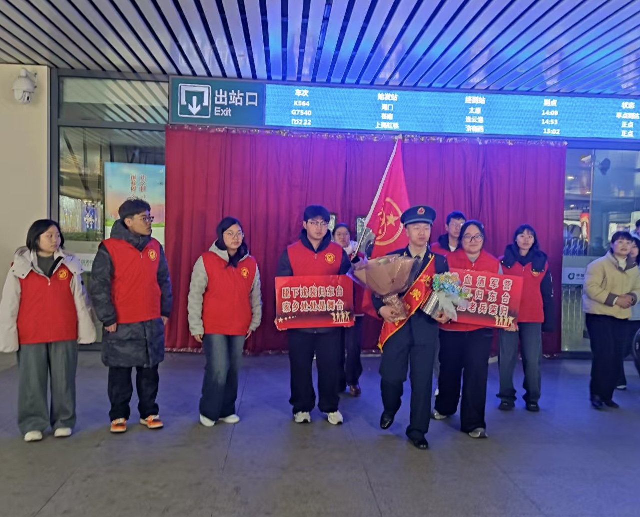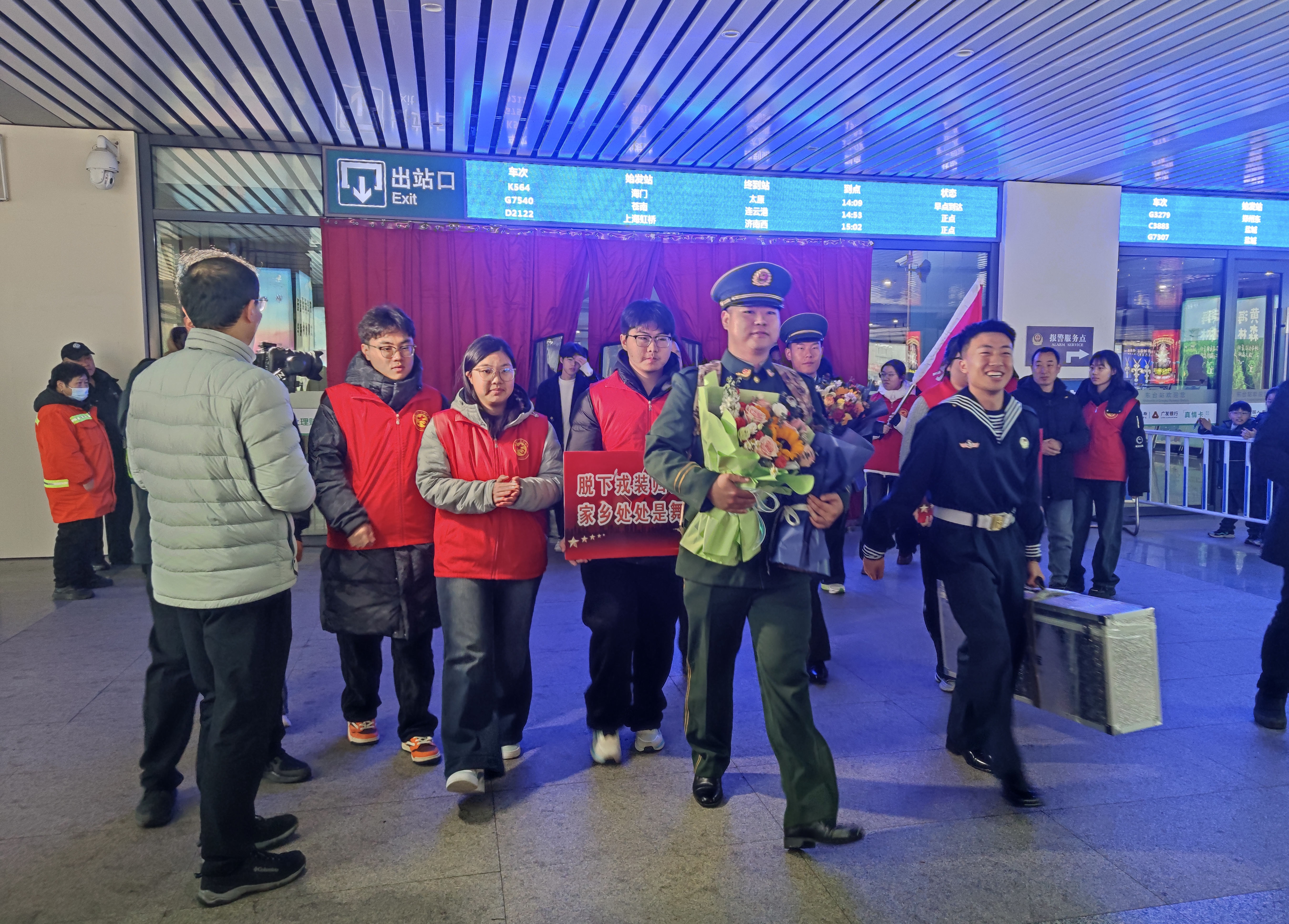 活动当天,志愿者身着“戎耀东台”志愿服装,手持鲜花与欢迎标语,早早在出站口整齐列队,满怀期待等候退役军人归来。当列车缓缓驶入站台,身着戎装、身姿挺拔的退役军人依次走出,志愿者立刻送上热烈掌声与欢呼声,将一束束鲜花递到老兵手中,一句句“欢迎回家”“致敬军人”的问候真挚温暖。志愿者主动帮忙搬运行李、引导出站,用细致贴心的服务,让返乡军人一踏上故土便感受到浓浓的尊崇与关怀。