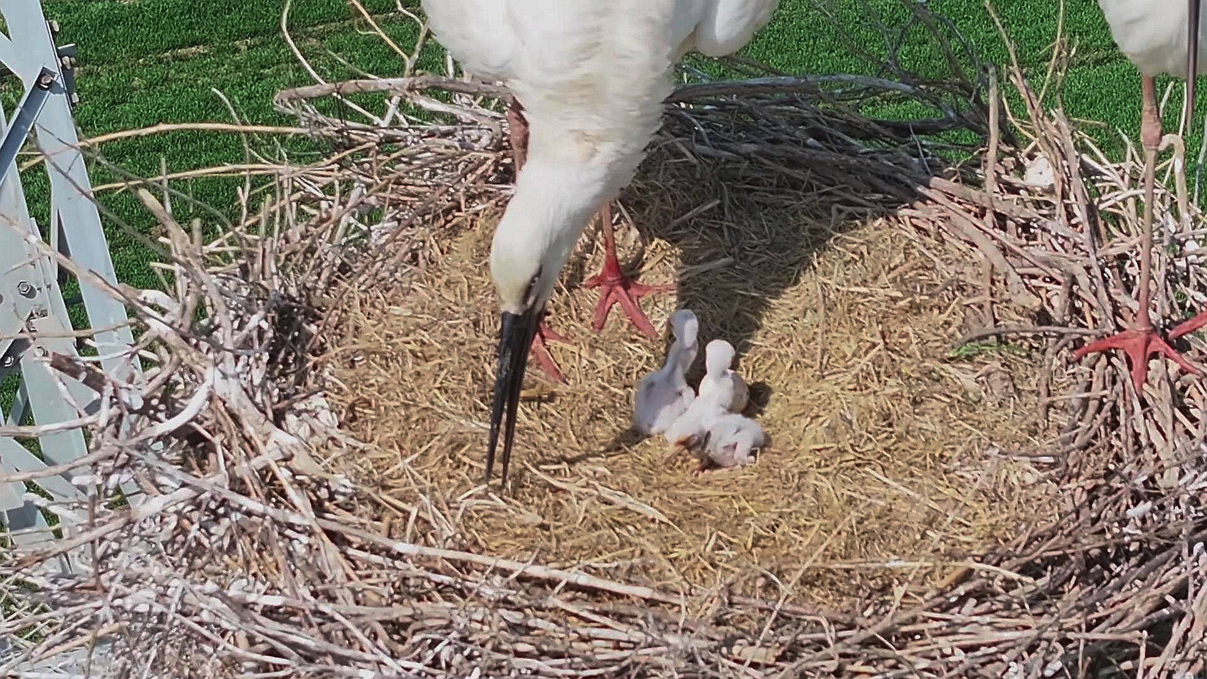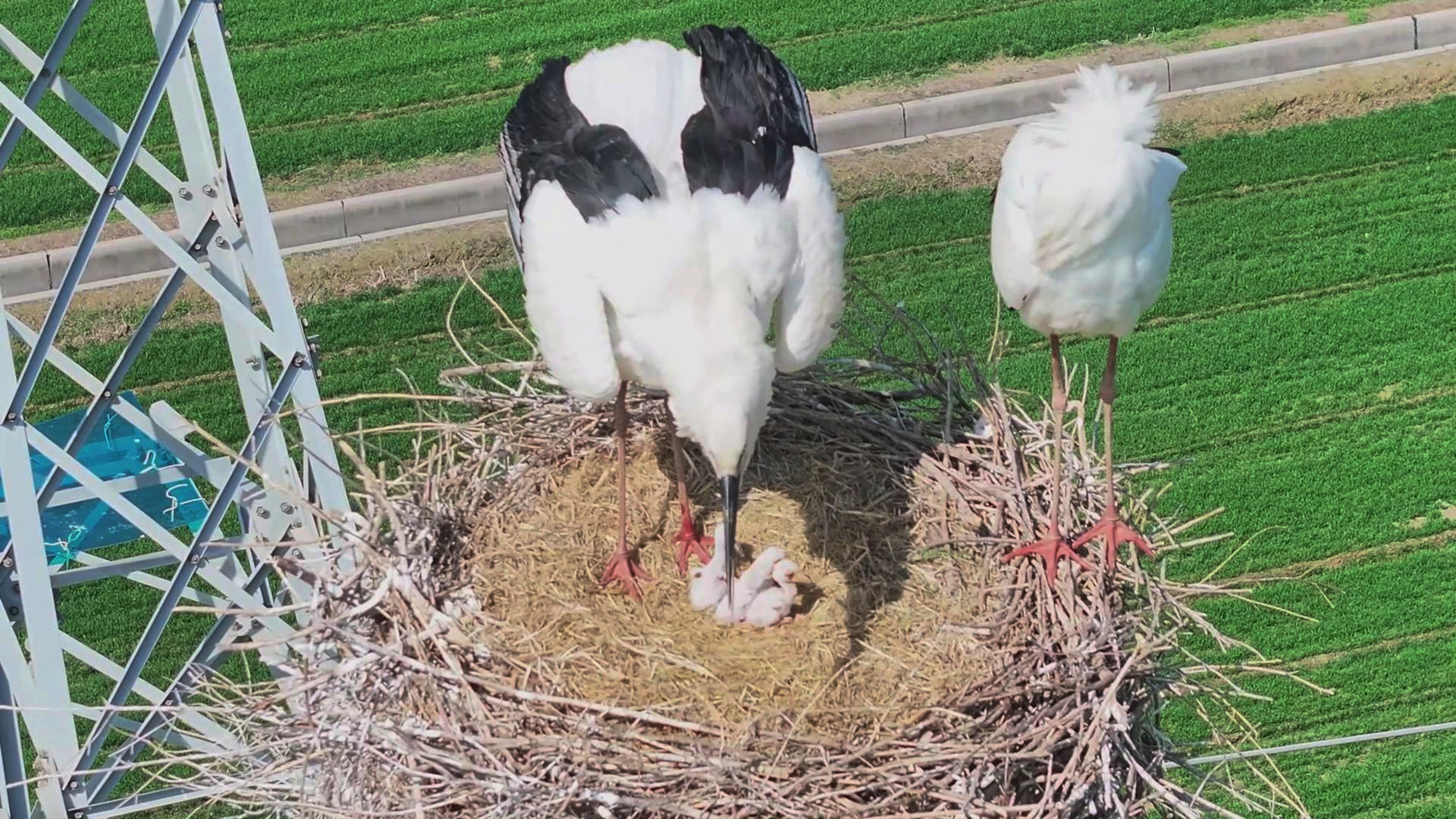 3月19日中午,宋婧再次携带无人机等设备来到巢区附近,启动无人机飞至鸟巢上空,清晰看到已有3只东方白鹳雏鸟破壳而出,另有一枚鸟蛋正在孵化。两只东方白鹳在巢边不时用喙修整鸟巢,随后其中一只卧下身来,继续孵化未出壳的鸟蛋。