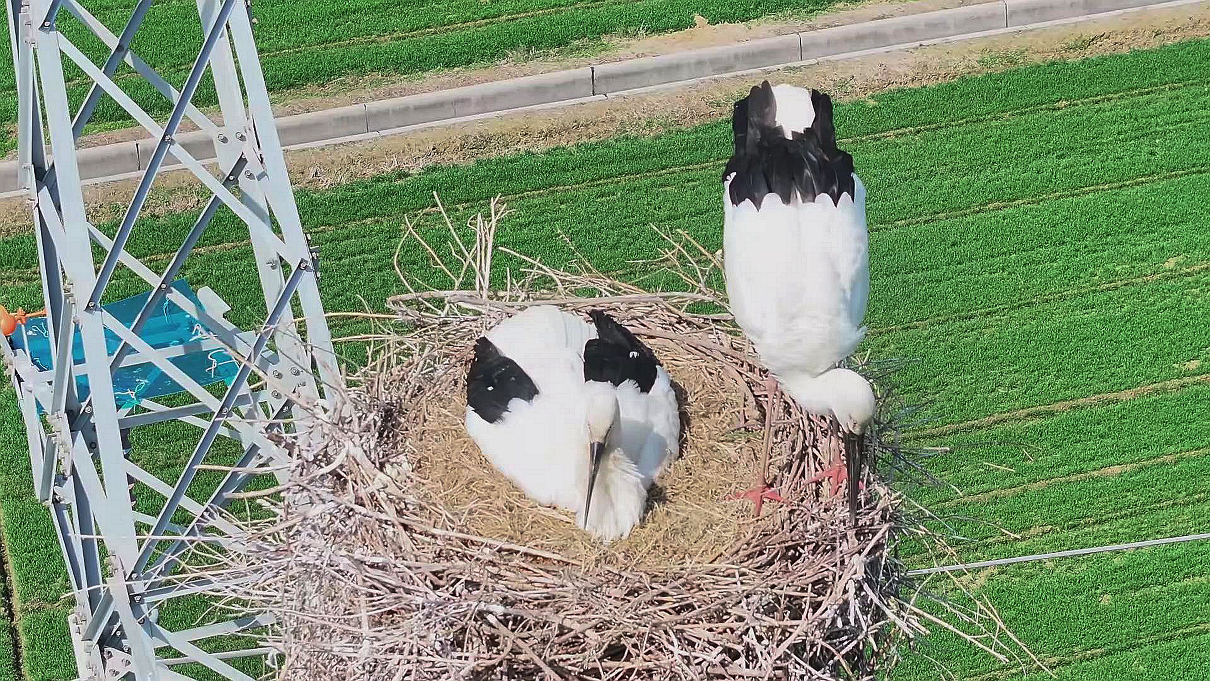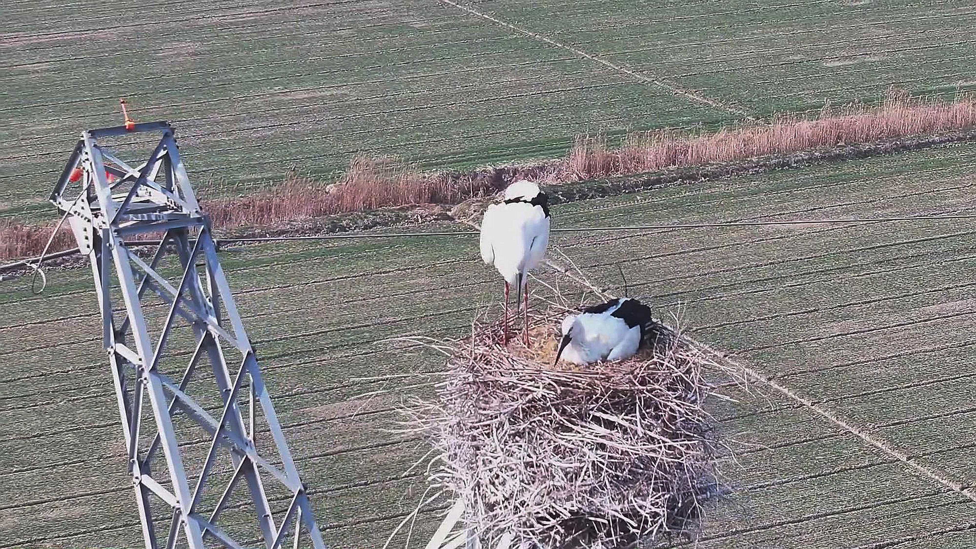拍摄者宋婧介绍,2月13日中午,她利用午休时间用无人机拍摄小麦生长情况时,发现五分场境内一座高压线铁塔上,有大鸟正在搭建鸟巢,便立即取出随身携带的无人机,在不惊扰鸟类的前提下进行拍摄,发现鸟巢内已有两枚鸟蛋。她将拍摄的视频交由专业人士辨认,确认这两只大鸟为国家一级保护野生动物东方白鹳。