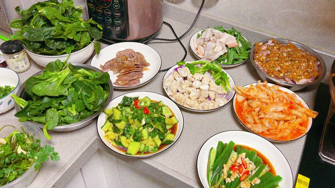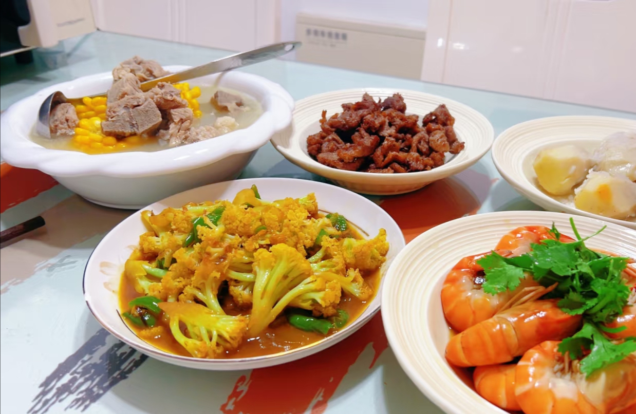 红烧鸡翅根、羊腿饭、红枣山药鸽子汤、香芋红烧肉、水煮牛肉、清炒花甲、红烧黑虎虾……翻看她的账号,就像翻开一本“上门做饭日记”,记录着当天的菜单、客户的喜好、厨房里的小插曲,还有心得和体会。