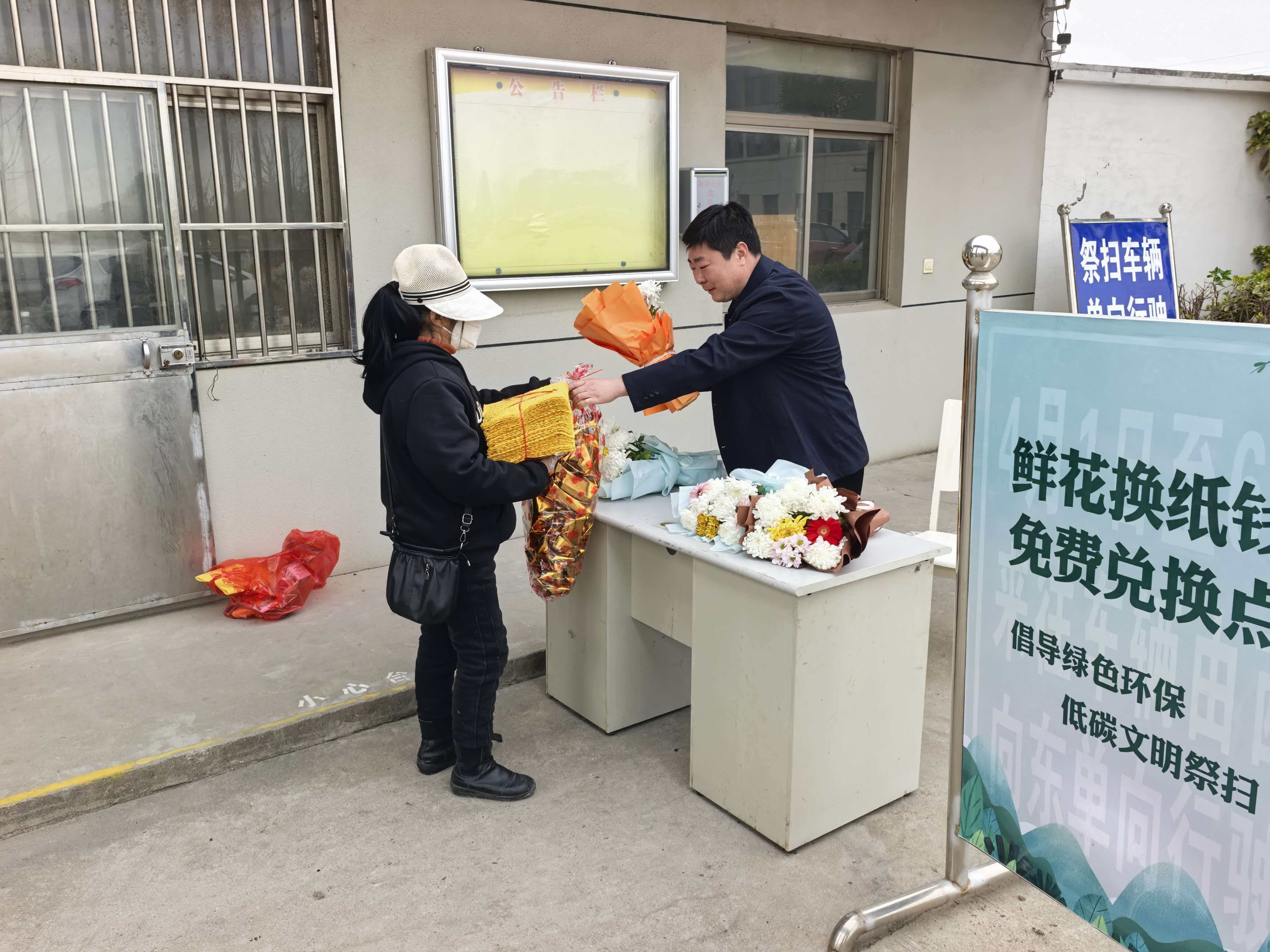 鲜花换“纸钱”,让祭扫回归“心祭”本真。在射阳公墓入口处,一场“鲜花换纸钱”的暖心服务有序进行。市民带着纸钱前来祭扫,工作人员总会耐心劝导,并递上一束菊花置换纸钱。不仅如此,该公墓还同步开展“卡片传情”活动,为群众提供精美追思卡片,引导大家将对亲人的思念化作真挚寄语,书写于卡片之上,与鲜花一同敬献,让祭扫更具温度与仪式感。一束鲜花、一张卡片,在减少了焚烧纸钱带来环境污染和火灾隐患的同时,更让祭扫形式与精神内核实现双重升华。