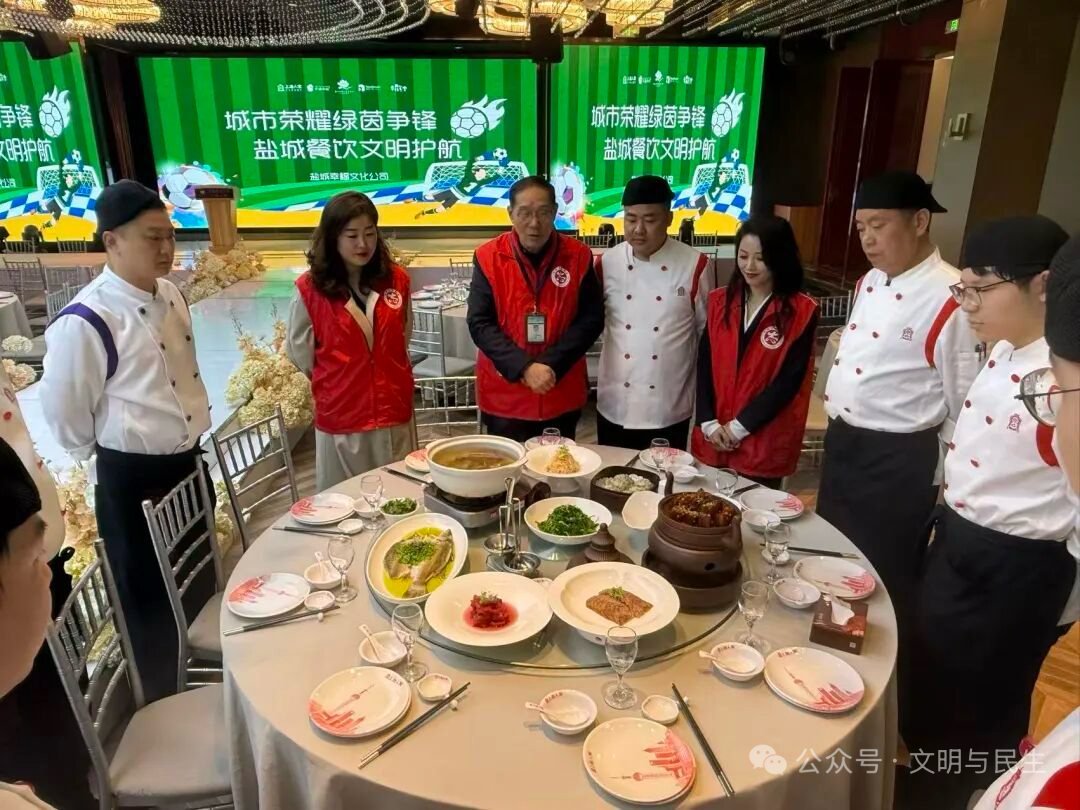 春潮涌动盐城大地,绿茵逐梦激荡城市情怀。为全力迎接2026江苏省城市足球联赛盐城主场赛事,全面提升全市餐饮行业文明服务水平,以最优城市风貌迎接八方球迷与四海宾客,4月17日,盐城市文明创建巡访团联合盐城市新时代劳模志愿服务团、盐城市新时代文明实践老党员工作室,共同开展“文明聚力迎苏超,盐阜待客展风华”擦亮文明餐饮服务窗口社会实践主题活动,以文明为笔、以美食为墨,精心绘就全国文明城市与红色英雄城市的独特风采。