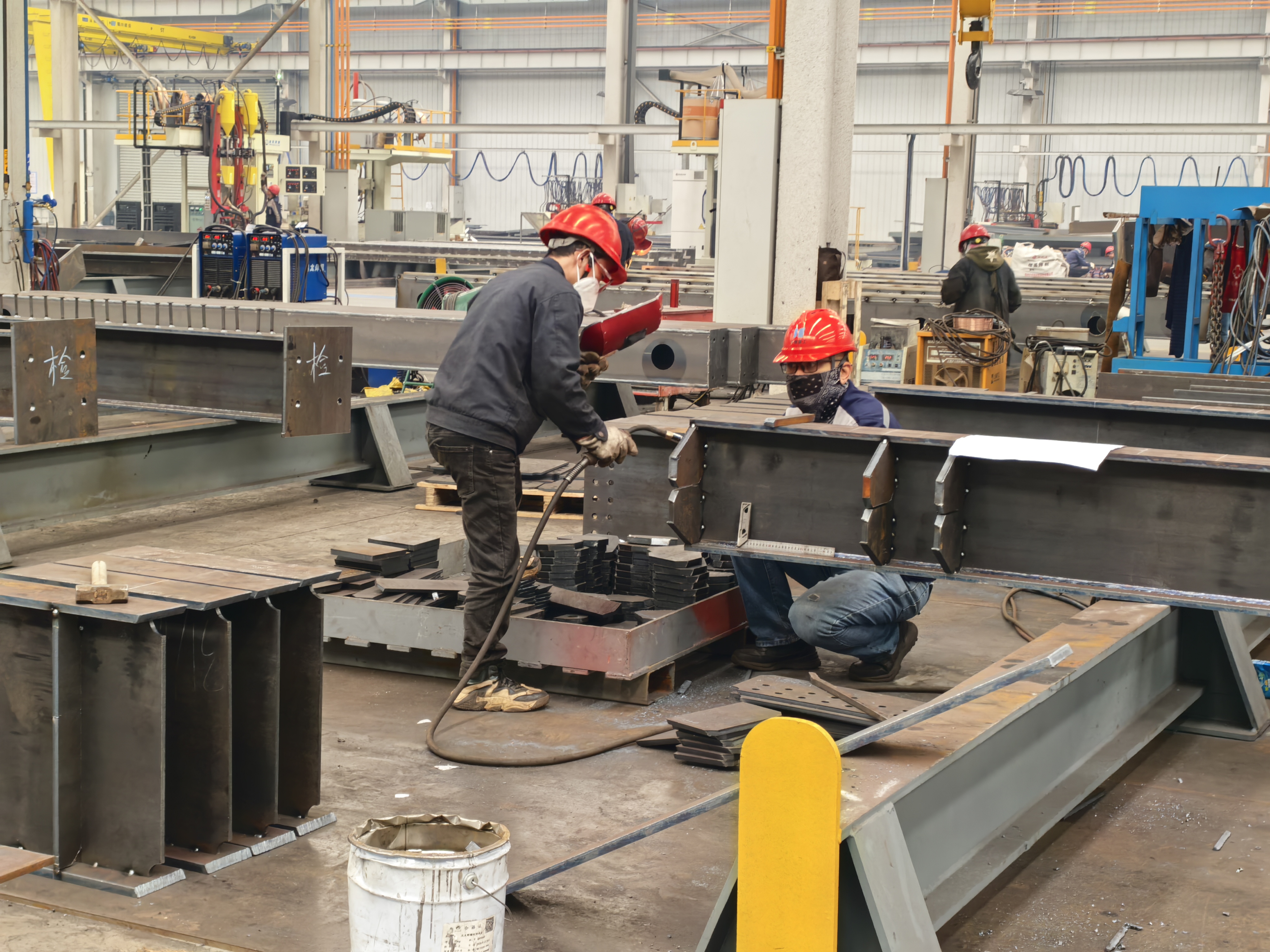 车间内,焊接工人手持焊枪,焊弧起落间,细密的焊花落在钢板上,转瞬凝成均匀的焊道;数控切割机不停运转,金属切割的滋滋声此起彼伏,下料精准利落;在自动化生产线上,钢材依次完成加工、传送,各工序衔接顺畅,工人们各司其职、专注作业,整个车间充满了务实高效的生产氛围。