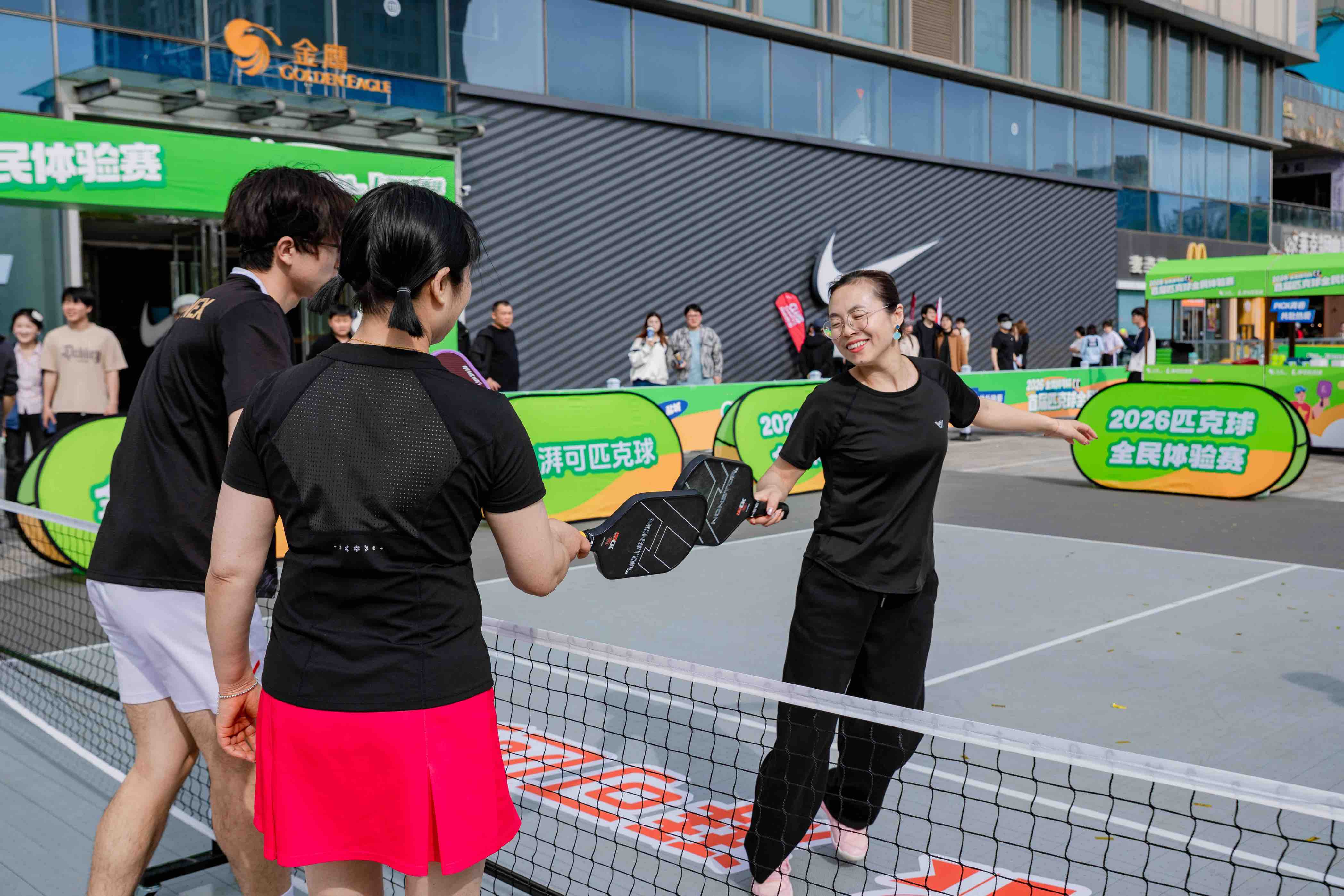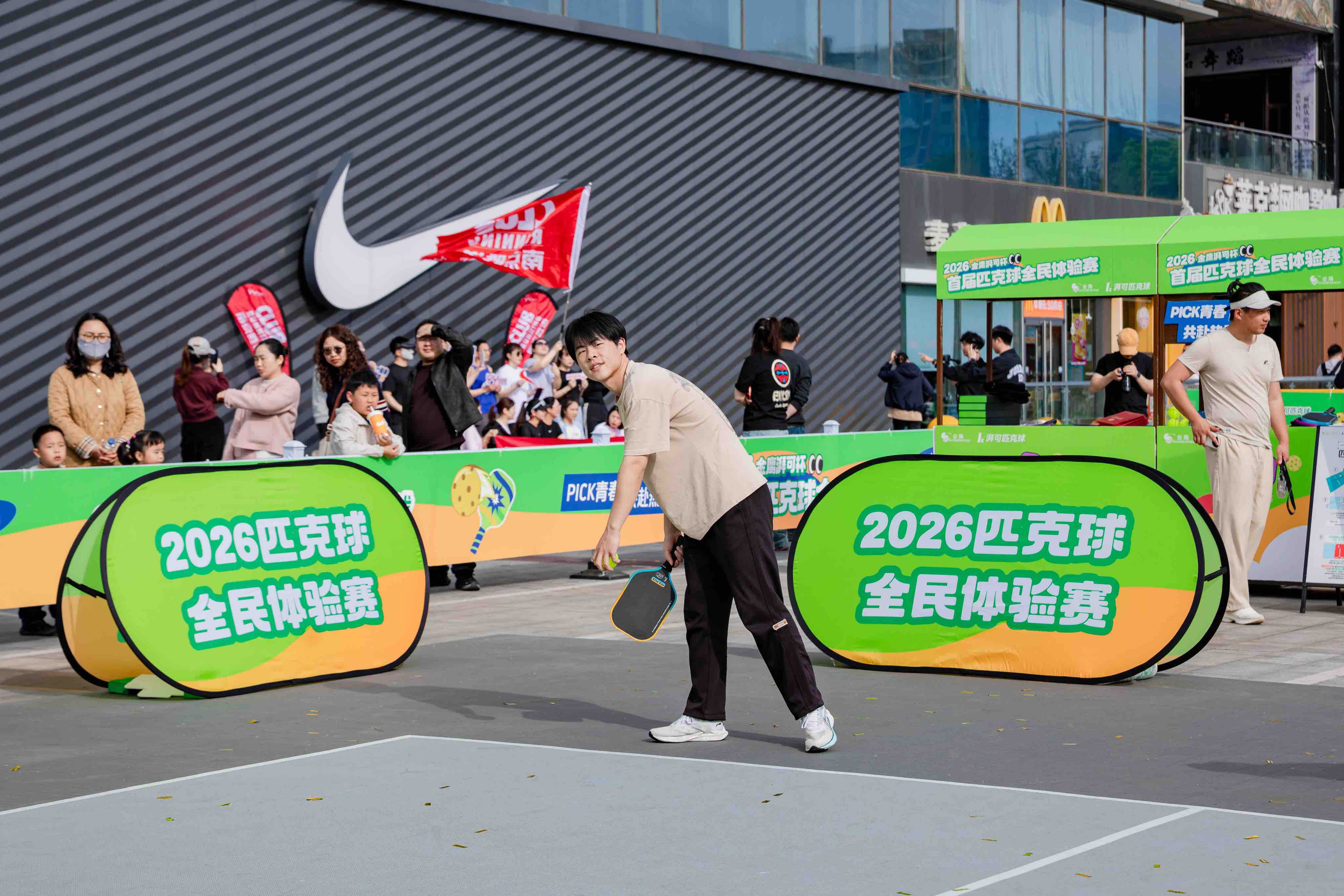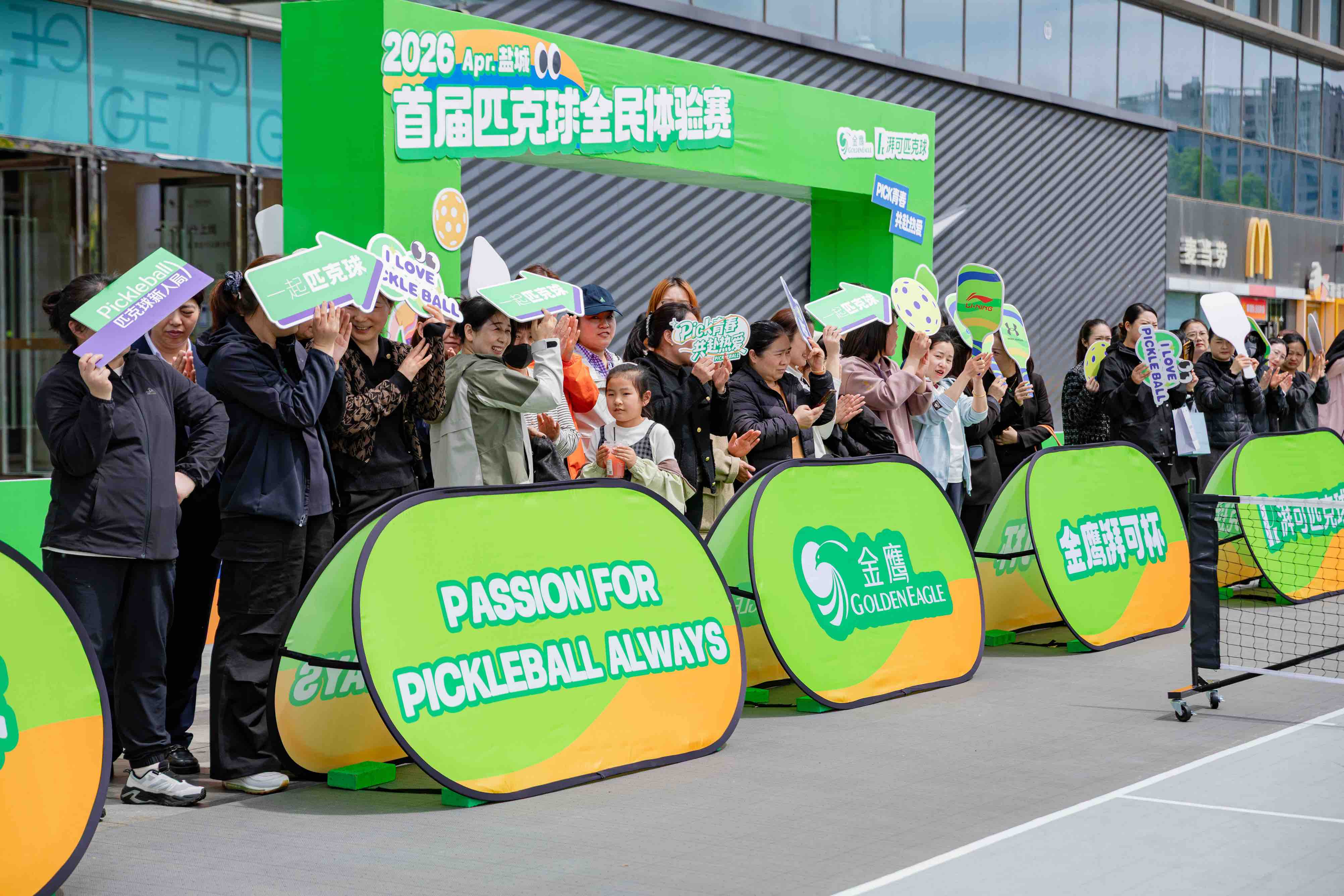 挥拍逐趣,以球会友。4月18日,2026盐城首届匹克球全民体验赛·金鹰湃可杯在金鹰聚龙湖店西广场热力开赛。作为一场“零门槛、高趣味、强社交”的运动派对,本次活动不仅为市民带来全新的运动体验,更让匹克球这项新潮运动走入更多人的视野。