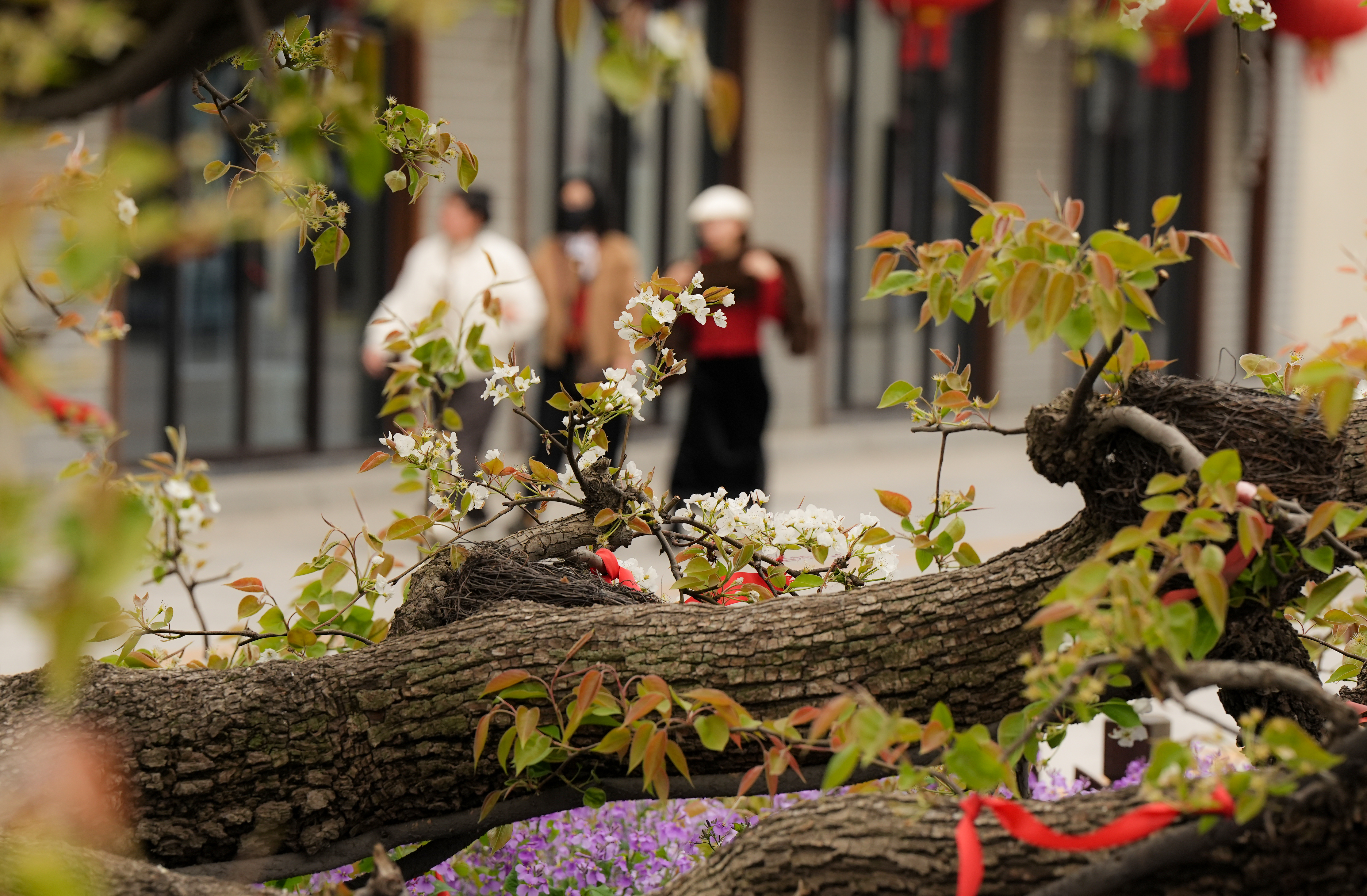 这棵“梨树王”高10米,树冠覆盖面积约80平方米,枝干遒劲、曲折盘旋,稳稳站在景区入口正中央,迎接一波波游客前来赏花踏春。