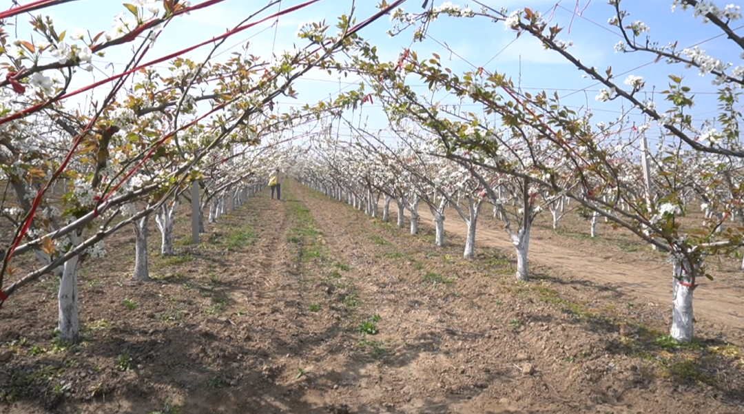 走进公司种植基地,只见梨园上方拉着横向网架,一行行梨树紧挨着整齐排列,枝条被细绳牵引连接在网架上,向两侧呈“V”形舒展。一阵风吹来,开满花的枝条轻轻晃动。