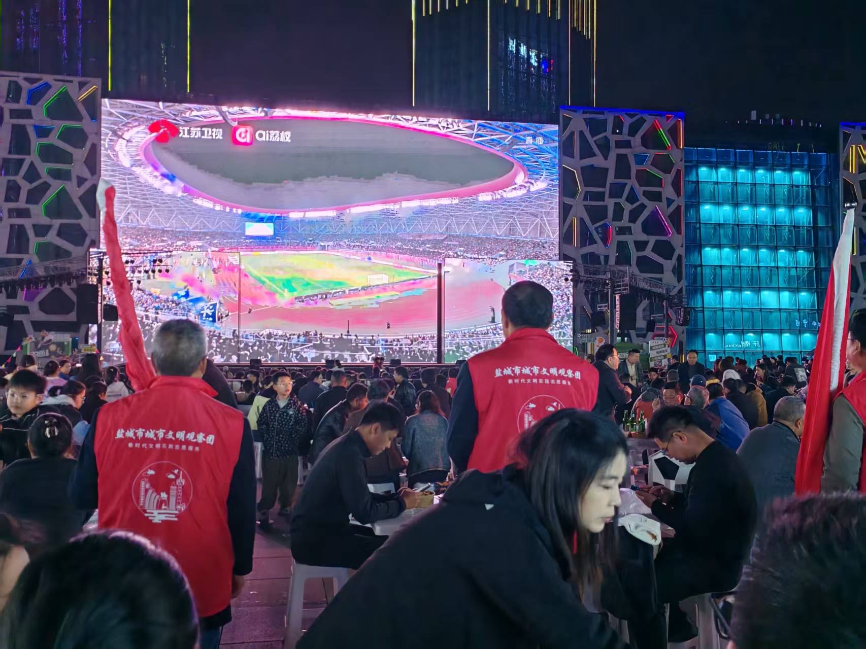 赛场之上,球员们奋力拼搏,展现体育精神;赛场之下,志愿者们暖心服务,彰显文明底色。当晚,三支志愿队伍还前往新弄里南广场、欧风花街圣马可广场等赛事直播第二现场,开展联动志愿服务。各大广场上,巨型屏幕实时直播赛事,挤满了前来观赛的市民与球迷,氛围十分热烈。赛前,“文明互动,乐享苏超”知识问答活动火热开展,文明养犬、文明观赛、勤俭节约、文明旅游等贴近生活的文明知识问答,吸引了现场居民踊跃参与、积极答题。在轻松有趣的互动中,文明理念潜移默化地深入人心,为赛事营造了浓厚的文明氛围。