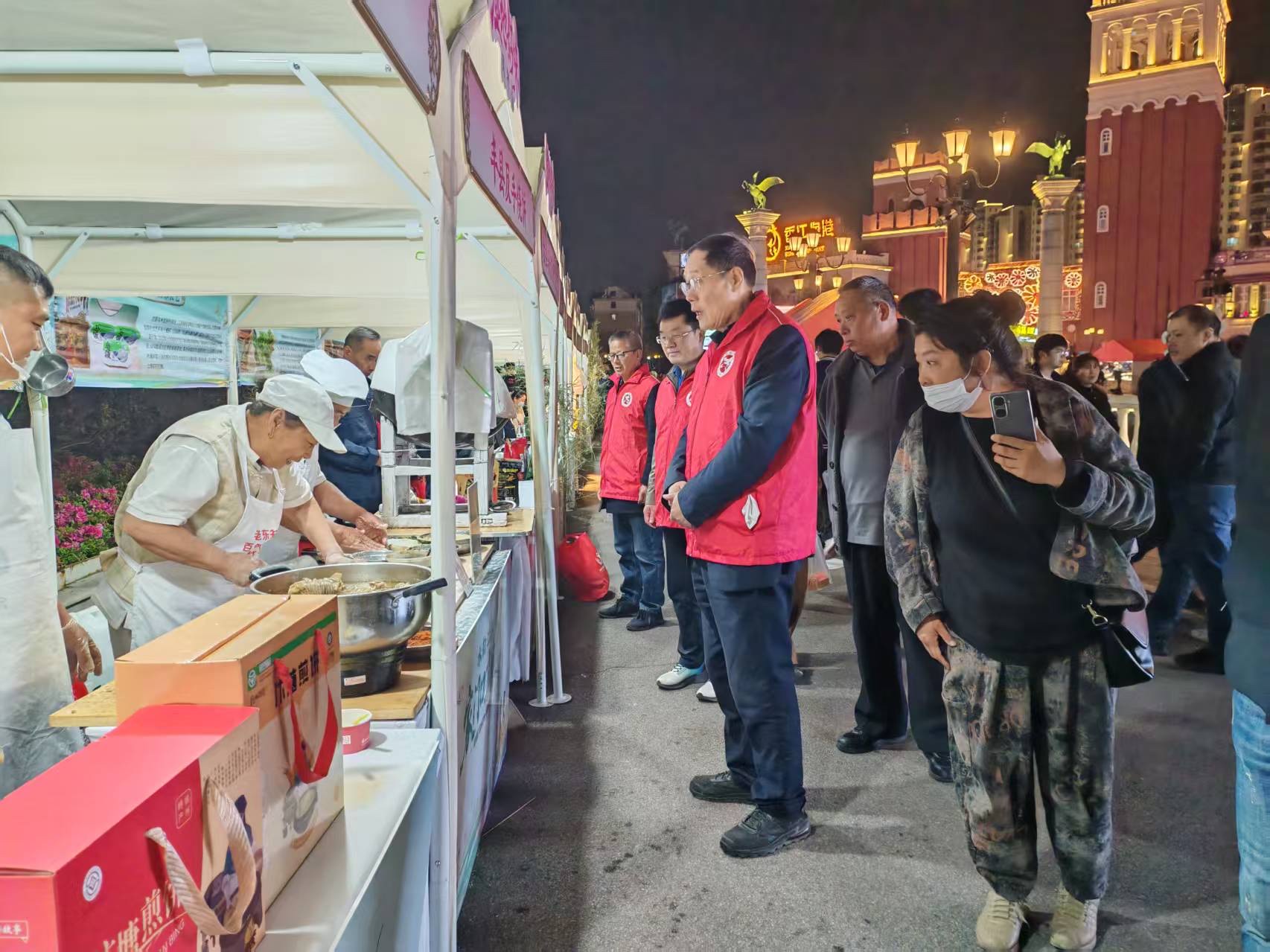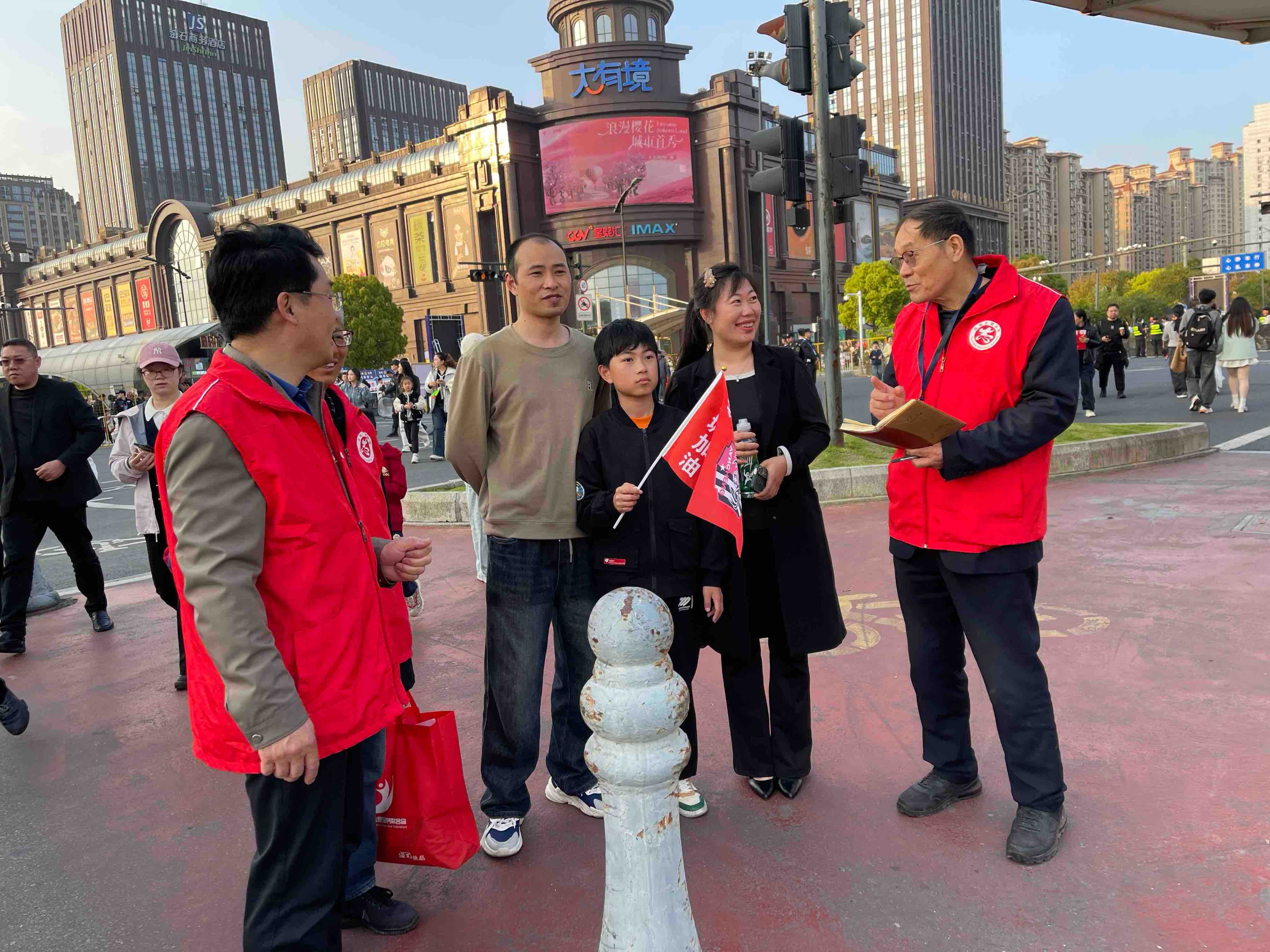 在欧风花街圣马可广场,志愿者与老党员们协同配合,全力维护观赛秩序,引导市民文明参与互动。遇到外地游客,他们主动讲解赛事安排、推介盐城文旅景点,将城市文化底蕴与体育赛事精神传递给每一位来客,让文明之风吹遍广场角落。