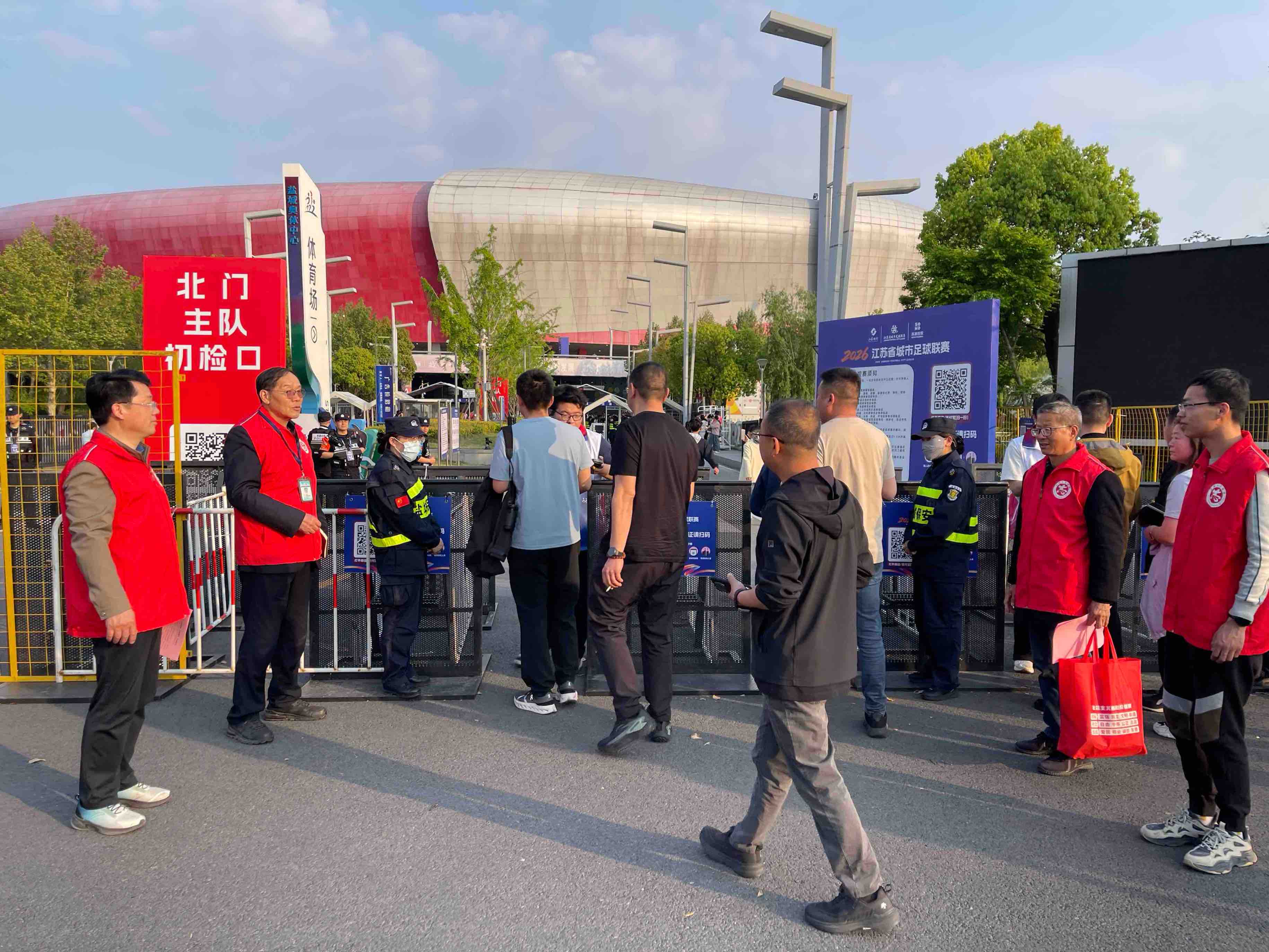 以足球为媒,赴文明之约。4月25日,2026江苏省城市足球联赛盐城主场赛事在盐城奥体中心体育场火热开赛,盐城队与宿迁队展开绿茵对决,精彩的足球盛宴点燃了全城全民健身、观赛助威的热情。盐城市文明创建巡访团、盐城市新时代劳模志愿服务团、盐城市新时代文明实践老党员工作室联合组建专项志愿服务队,深入赛事主场及各大观赛第二现场,开展文明巡访、秩序维护与文明观赛宣传工作,并提供便民服务,用一抹抹志愿红勾勒出全国文明城市盐城的动人风采,让足球激情与城市文明同频共振。