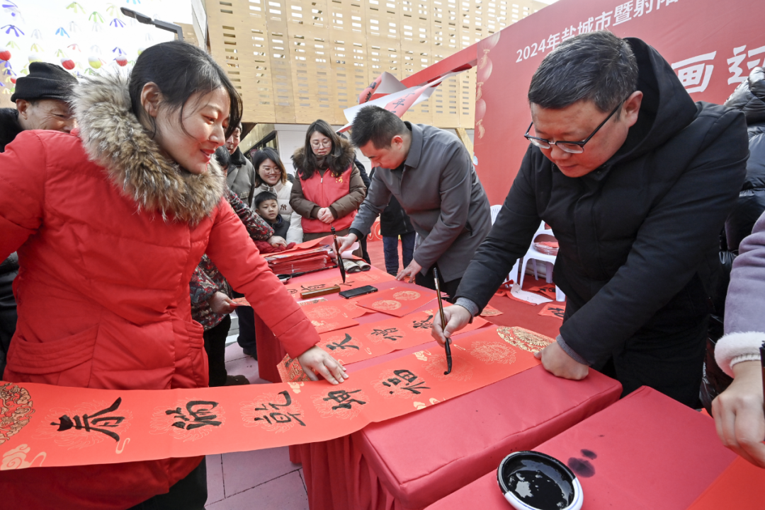 “龙年龙岁龙腾飞,春日春风春浩荡”“门迎百福福星照,户纳千祥祥云门”,最为热闹的当属送春联活动。市县15位书法家当场铺开笔墨纸砚,一副副吉祥喜庆的大红春联一挥而就,群众手捧带着墨香的手写春联喜笑颜开,空气中弥漫着春节将至的欢乐气氛。射阳县书法家协会主席顾正元说,当天市县书法家书写200多副春联、福字800多个,“书书画画过大年”,给群众送上祝福。