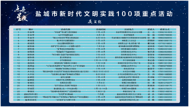 点亮城市星光,“趣”玩人间烟火。7月5日晚,2024年盐城市“点亮星夜”夏季晚间新时代文明实践主题活动启动仪式在亭湖区1956星剧场举行。活动现场发布“点亮星夜”盐城市新时代文明实践100项重点活动,全市各地从7月份开始,充分利用夏季晚间时段,大力开展新时代文明实践“夜模式”,围绕群众感兴趣、愿意来、得实惠,推出“夜文化”“夜经济”“夜课堂”“夜服务”“夜健康”五大主题文明实践新场景。