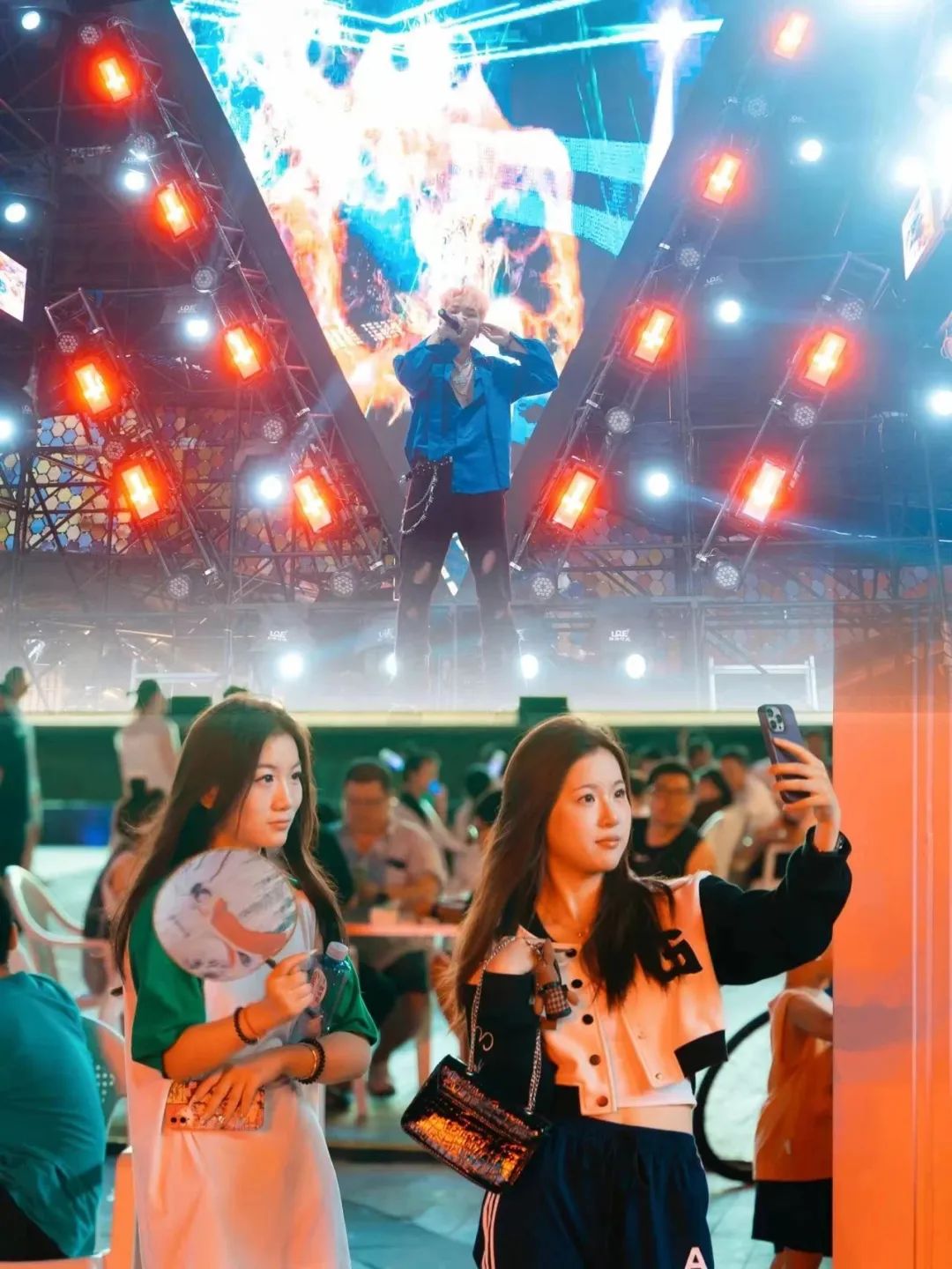 夜间音乐狂欢是让人们短暂逃离现实的多巴胺,夜市美食是最接地气的人间烟火。演出场地内电音季带来的震撼与激情持续升温,而相邻的渔档长街大排档则是另一番热闹的景象,捞汁小海鲜、臭豆腐、拇指煎包、烤冷面、酸梅汤、鲜榨果汁……熙熙攘攘的人潮、香气扑鼻的美食,听觉与味觉激情碰撞,音乐声和欢笑声此起彼伏。