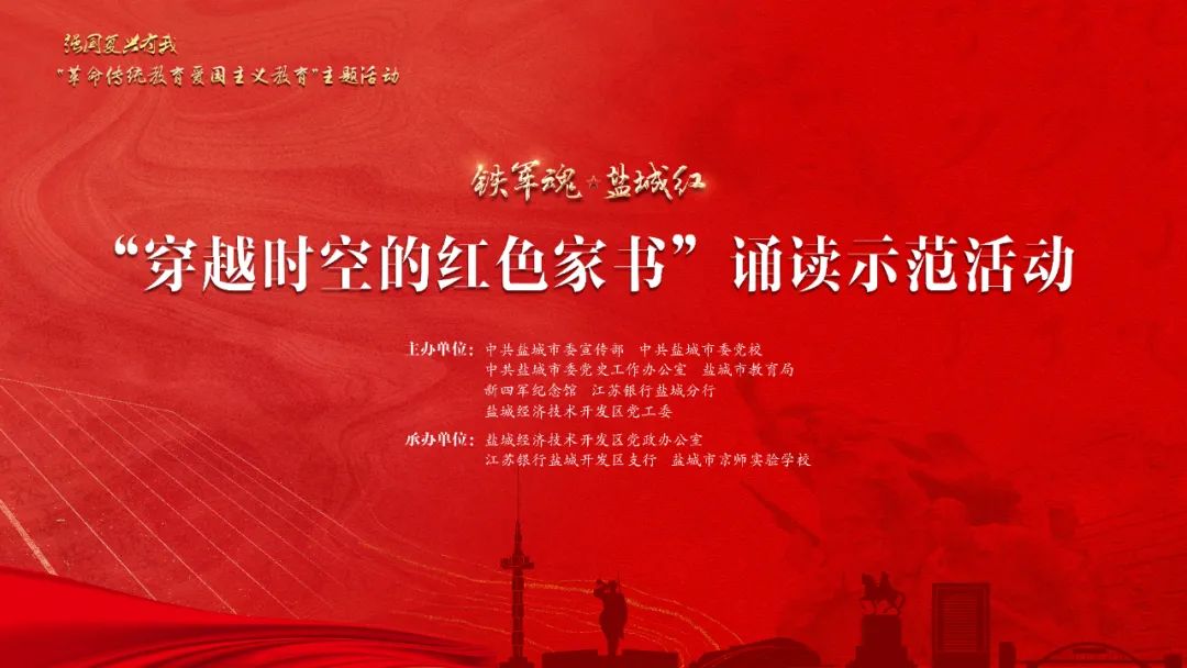为充分利用好新四军历史生动教材,在全市广泛开展革命传统教育和爱国主义教育,让红色基因深植盐阜人民血脉,让信仰之火在盐阜大地生生不息,9月29日下午,我市在盐城京师实验学校开展“铁军魂 盐城红——穿越时空的红色家书”诵读示范活动。