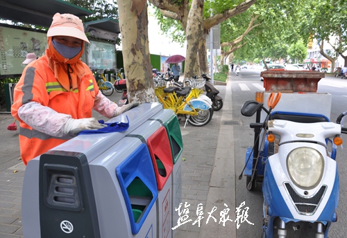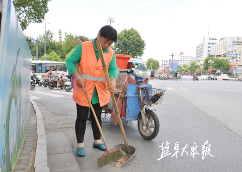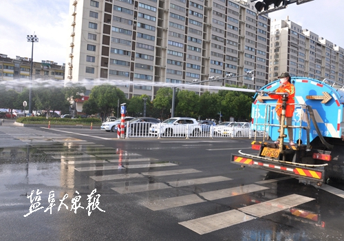 炎炎夏日,环卫工人们坚守在工作岗位上,用汗水为创文助力。7月16日,环卫工人们在酷热的天气下,为路面降温、清扫保洁。盐阜大众报报业集团全媒体记者 黄海峰 摄