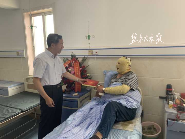 △2019年5月31日,市见义勇为基金会秘书长鲁昌钊给沈海滨送上1万元慰问金。(资料图)